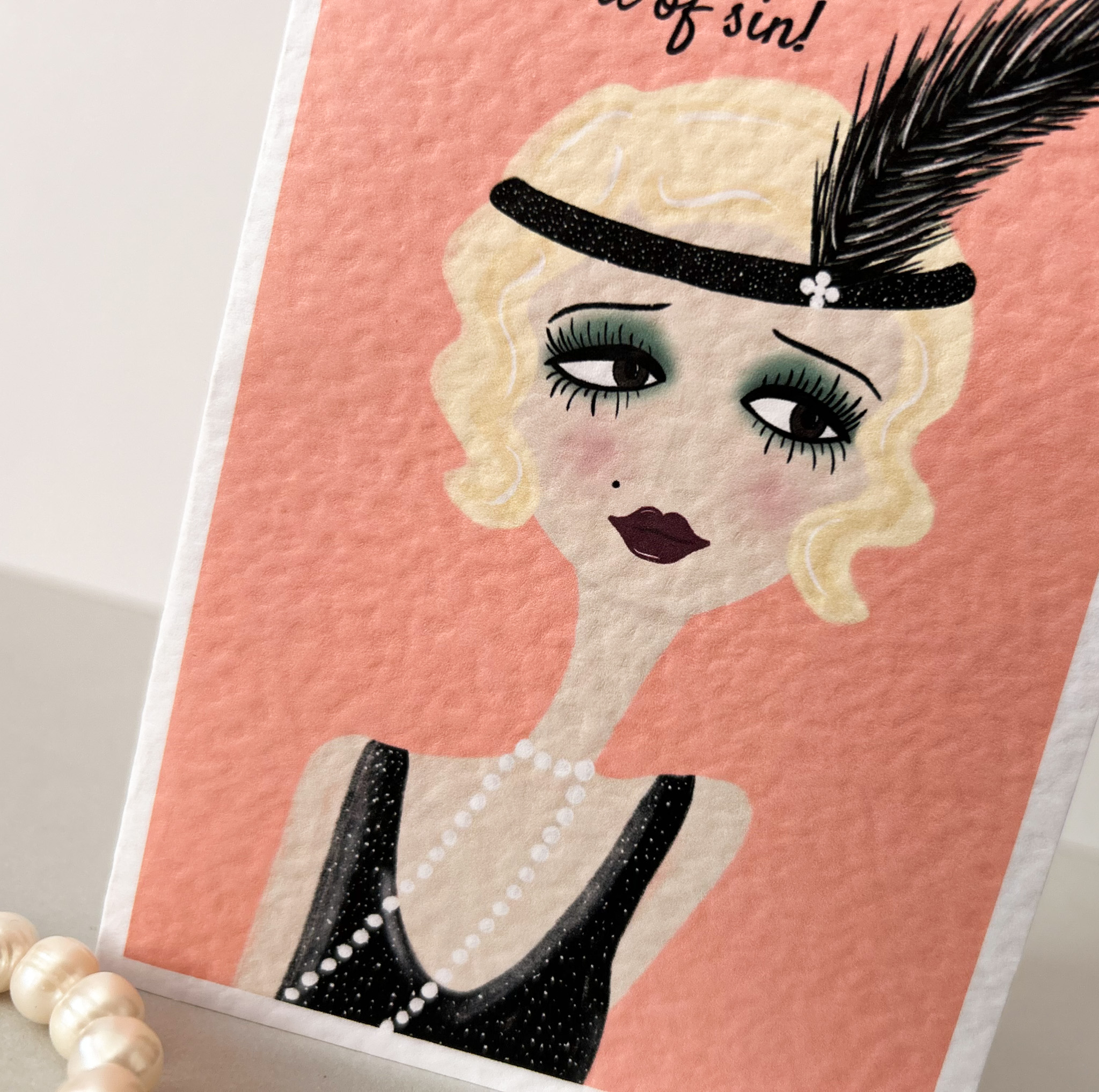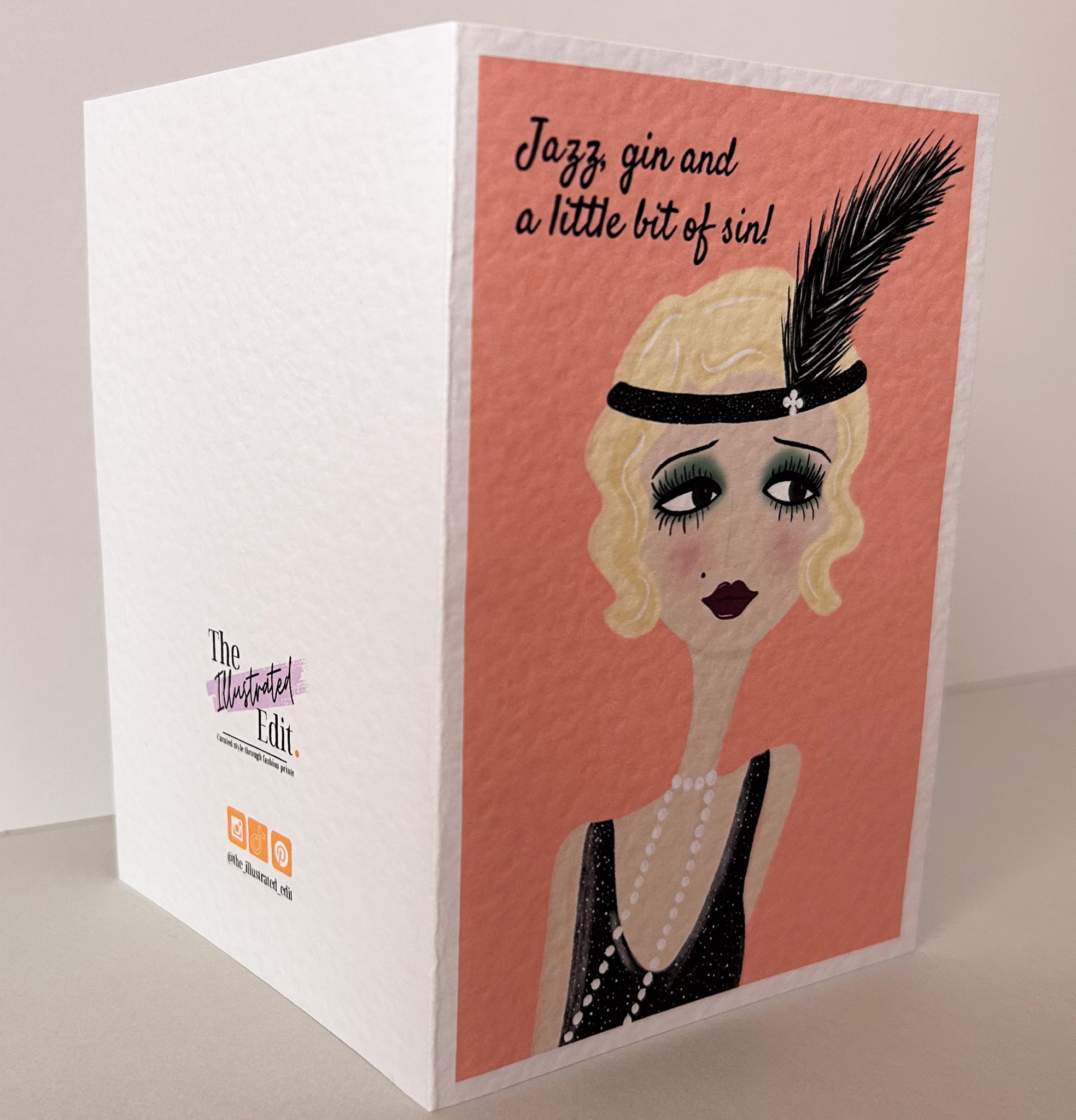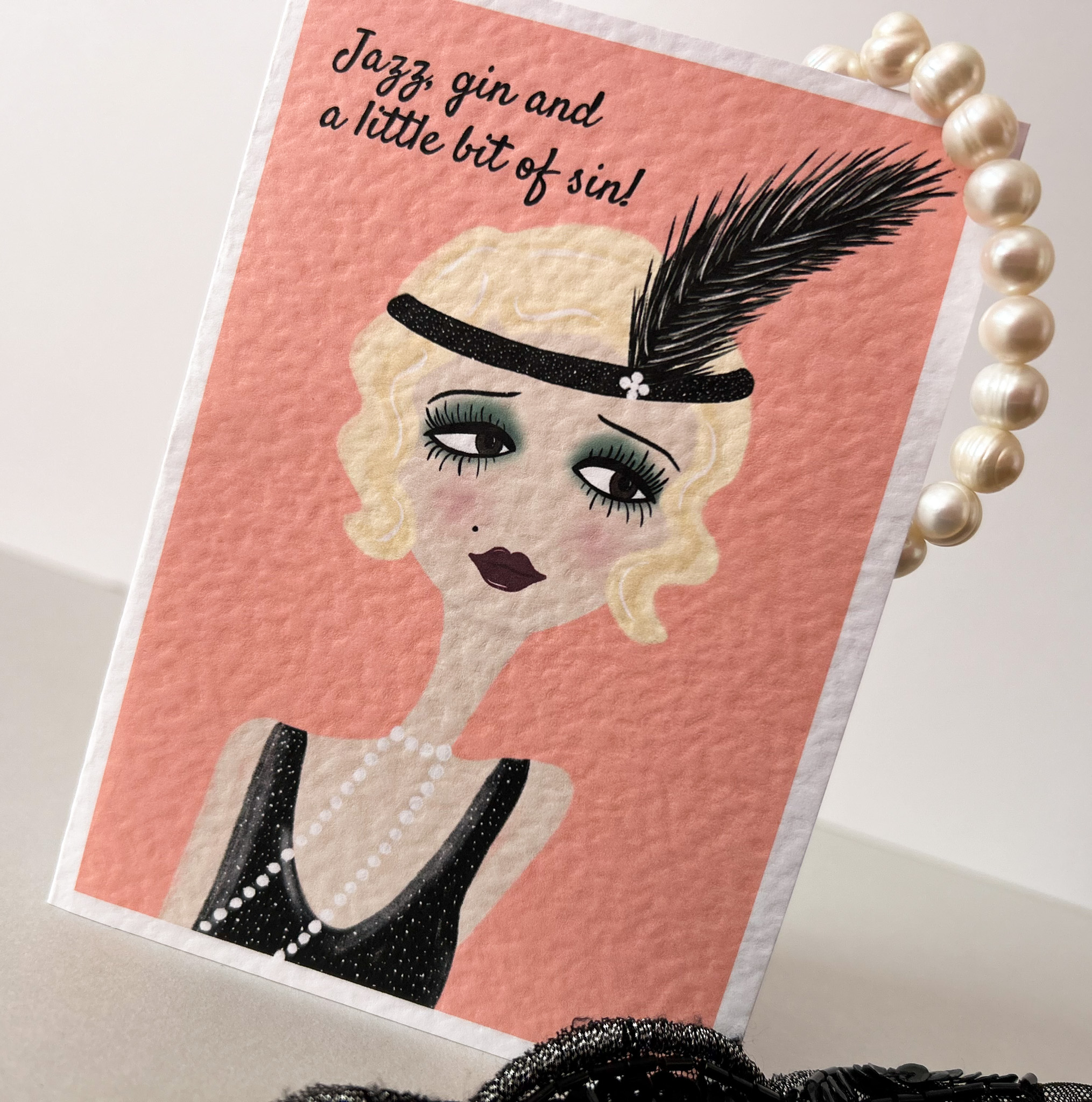 The front of the card reads: “Jazz, gin, and a little bit of sin!”—making it an ideal choice for birthdays, celebrations, or simply sending a chic and sassy note to a friend!