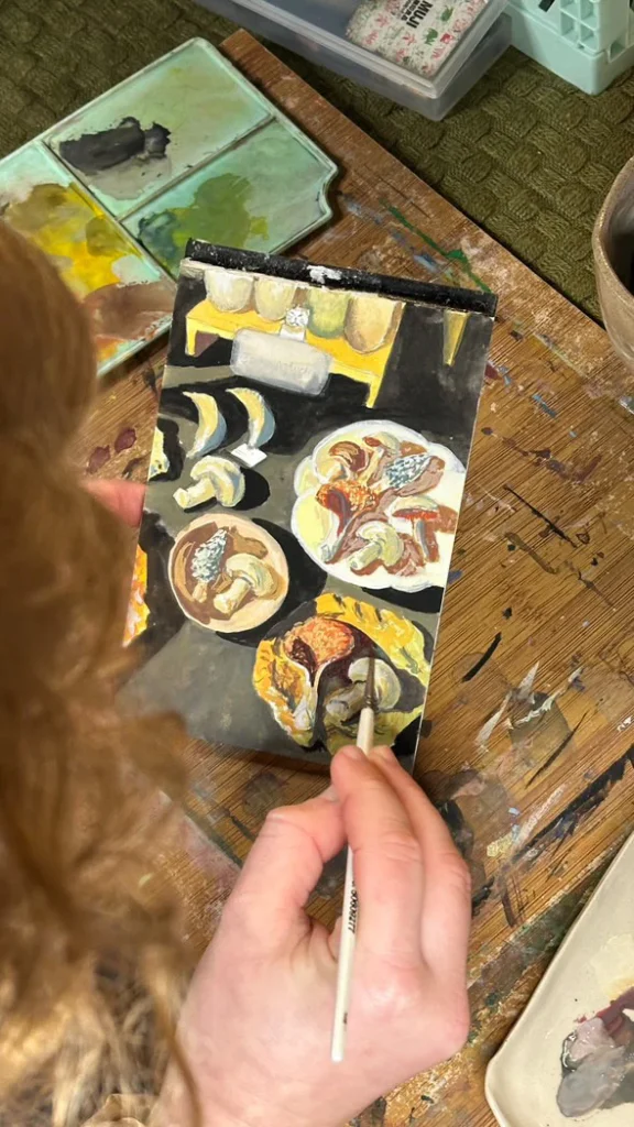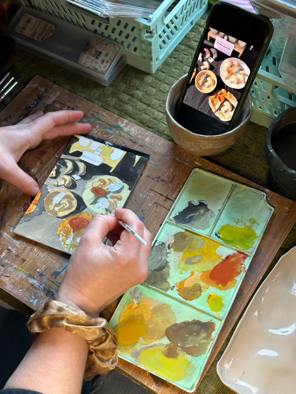 Hello! I’m Lina from Lina Nou Studio. I’m excited to share a behind-the-scenes look at how my artwork comes to life. Using my latest painting, Ceramic Starters (Mushrooms & Dumplings), I want to take you through my creative process. This includes everything from inspiration to the final brushstroke.