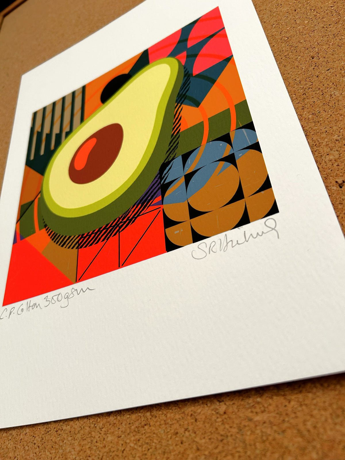 This vibrant giclee print brings a bold pop art energy to your space. A stylised avocado takes centre stage, its creamy flesh and rich brown pit rendered with crisp detail on museum‑quality 300 gsm paper. Behind it, an abstract mosaic of geometric shapes in teal, coral, and warm orange adds movement and contemporary flair.