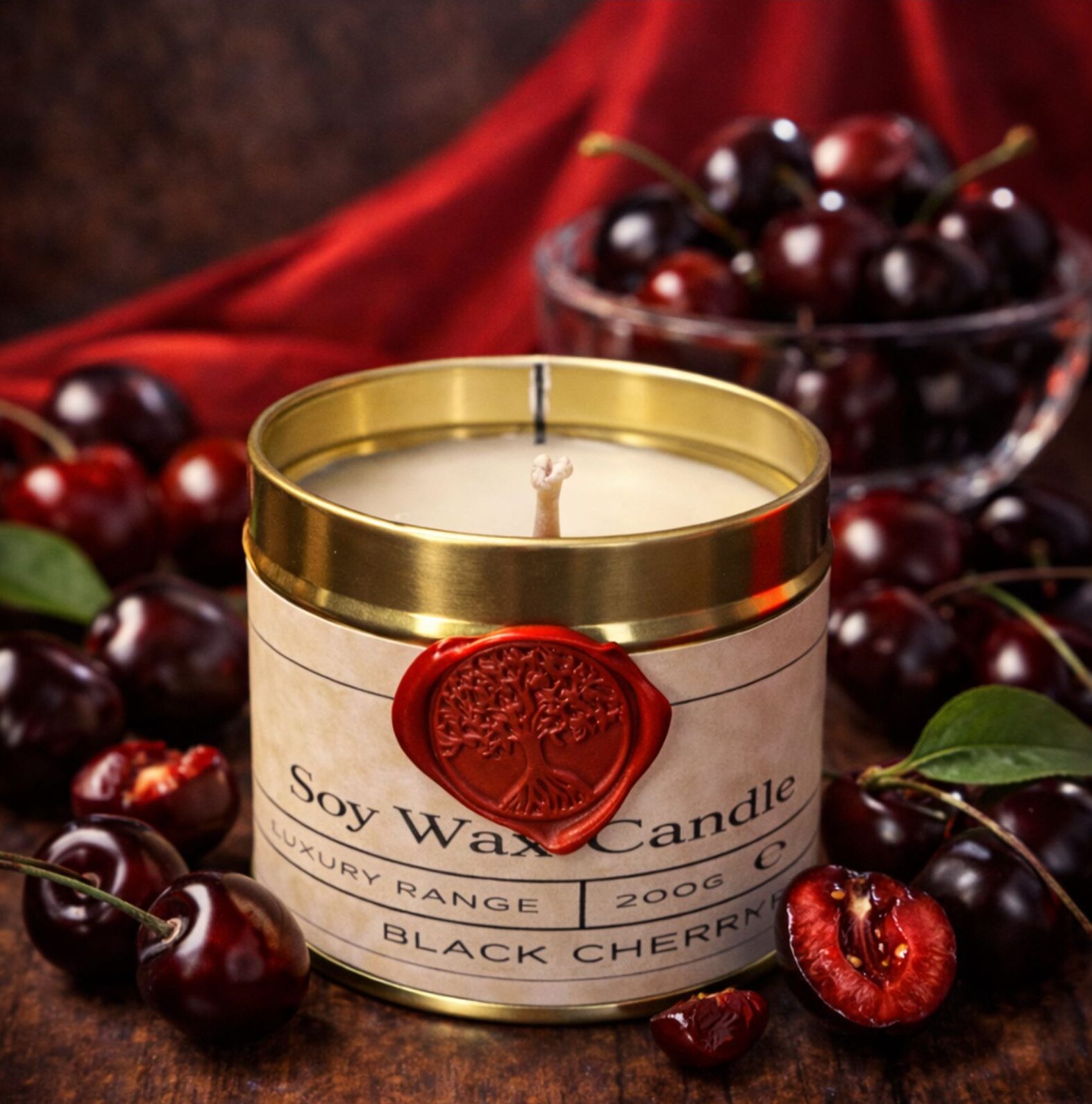 A rich, indulgent black cherry scent with deep fruity notes, hand-poured in a luxury gold tin.