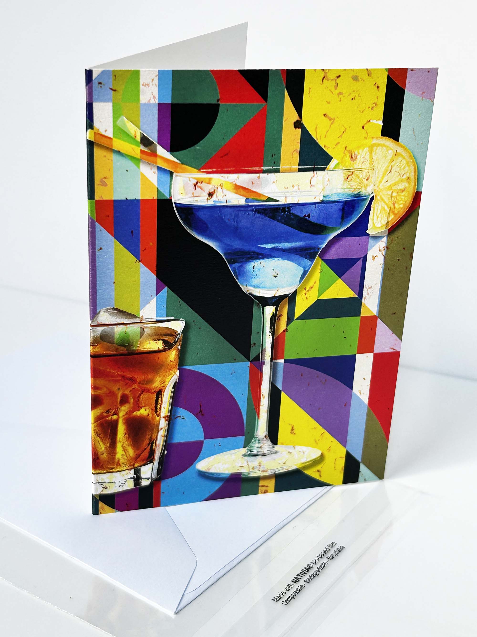 A brightly coloured greeting card featuring a bold blue Lagoon cocktail illustration, printed on premium 300gsm textured art card.