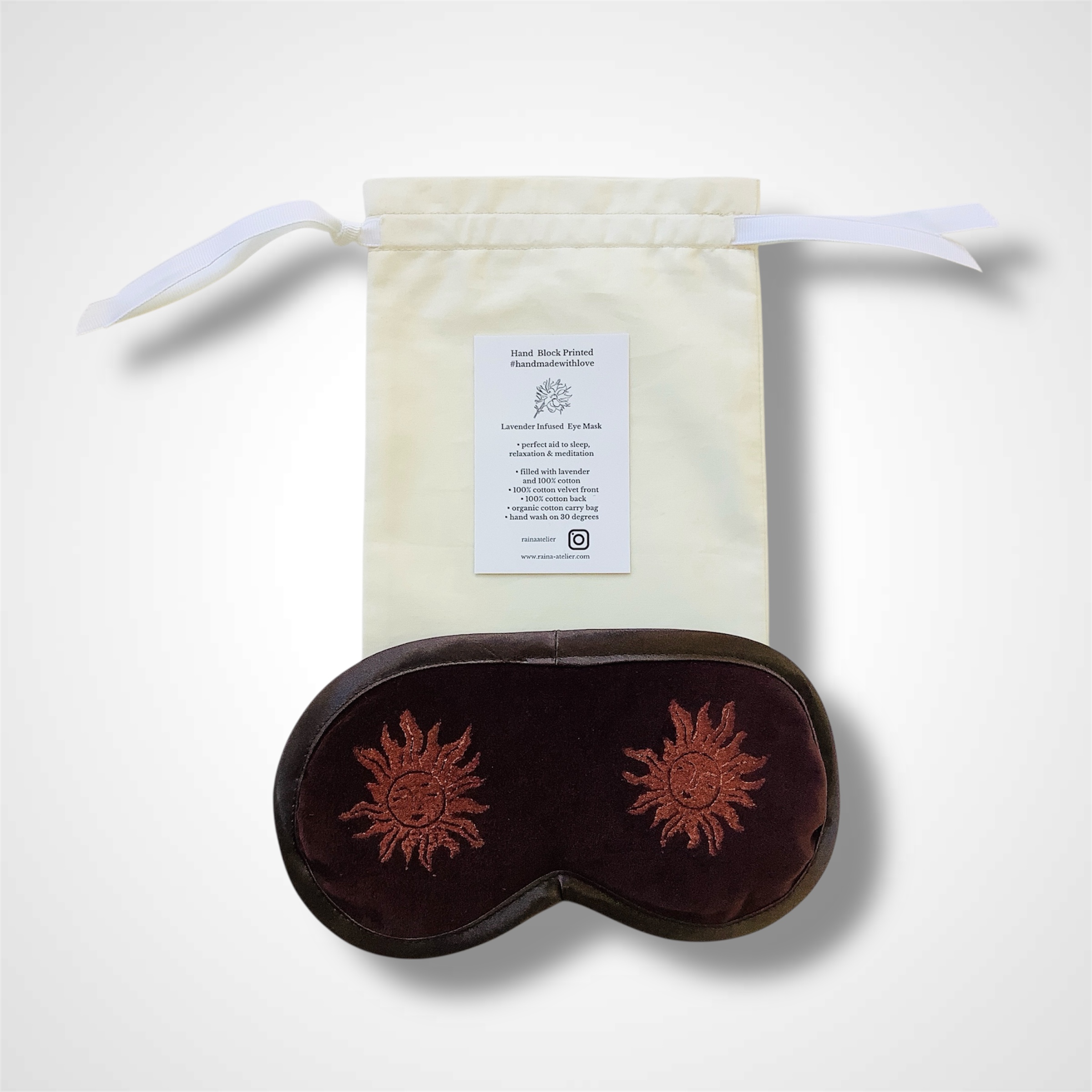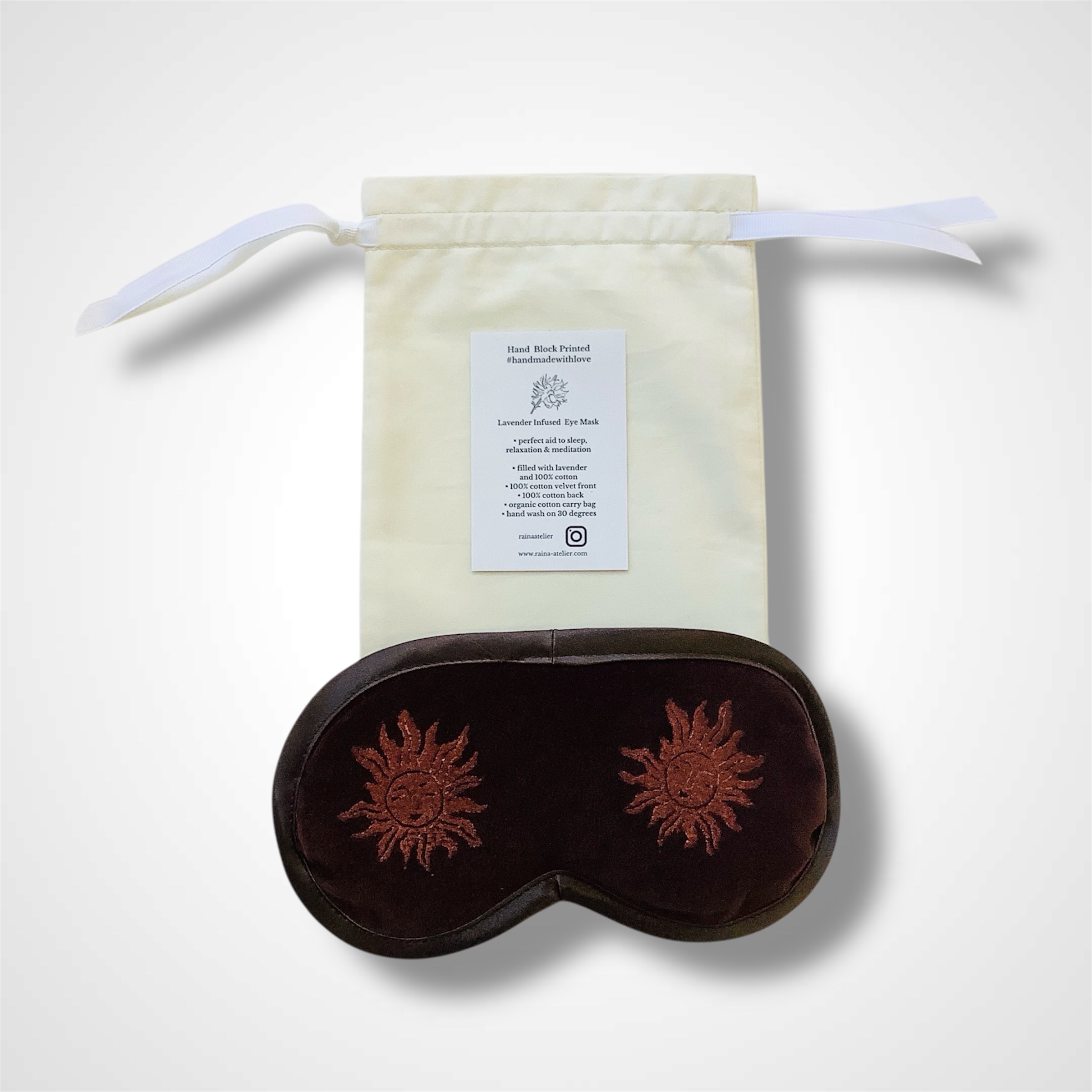 Introducing Raina Atelier Chocolate Sun Velvet Lavender Infused Eye Mask – your ultimate relaxation companion for a rejuvenating self-care experience. Crafted with utmost precision, this luxurious eye mask is designed to provide optimal comfort and promote deep relaxation. Made from the finest 100% cotton velvet fabric, its rich brown shade exudes elegance, while the subtle copper sun motif add a touch of celestial charm.