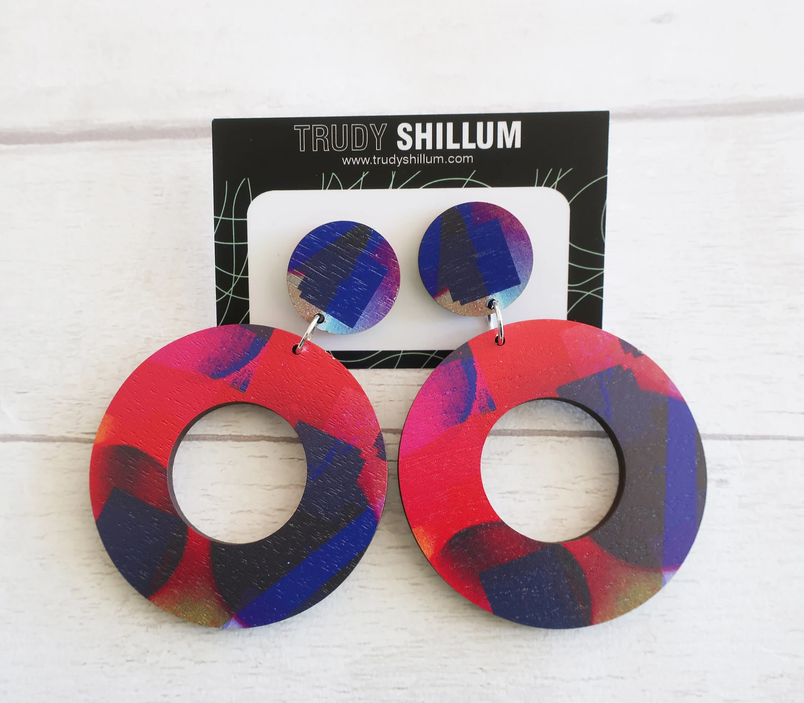 The earrings measures 8.75cm drop (3.5″) x 6cm (2.4″) across the largest hoop, the small circle is 2cm across and they are beautifully lightweight.