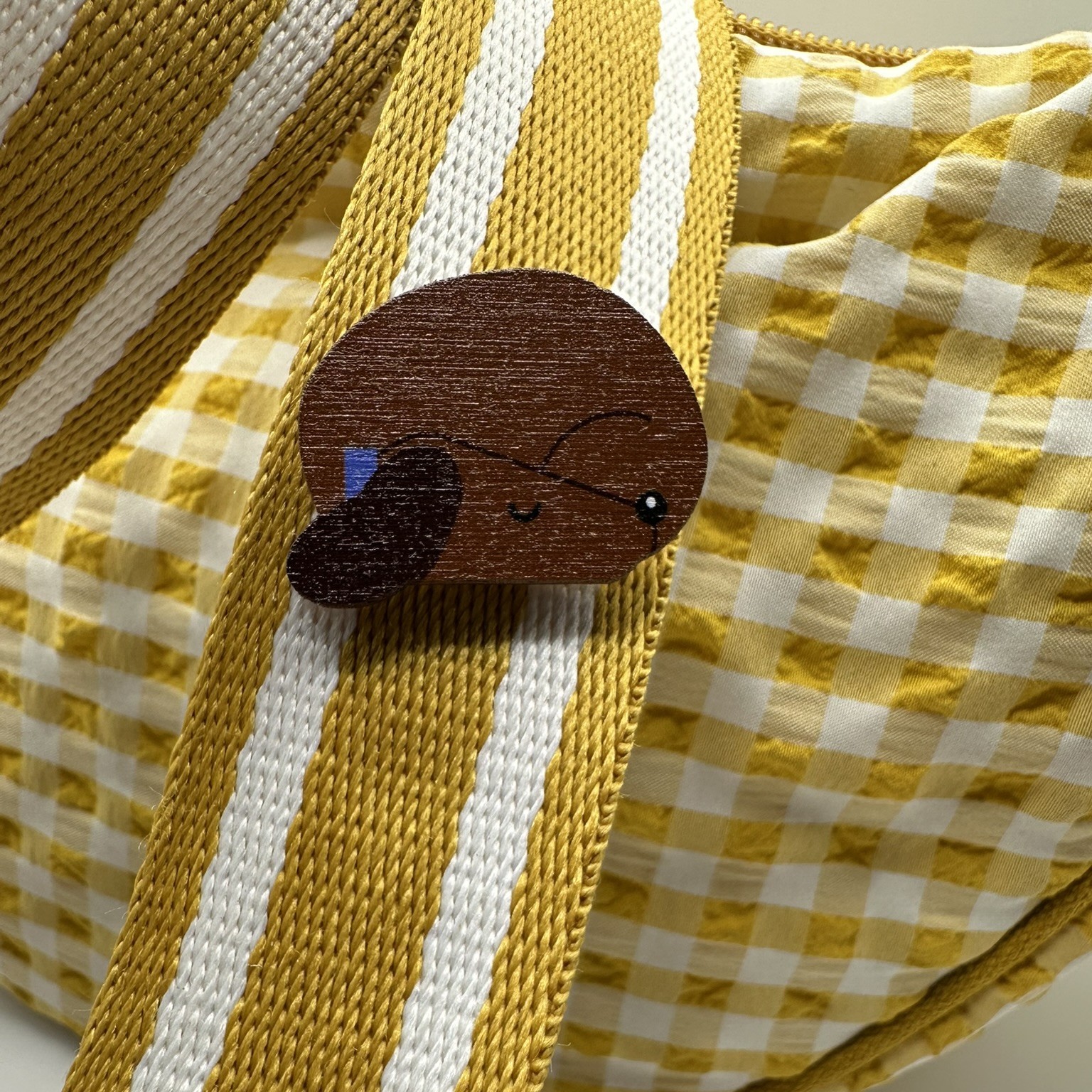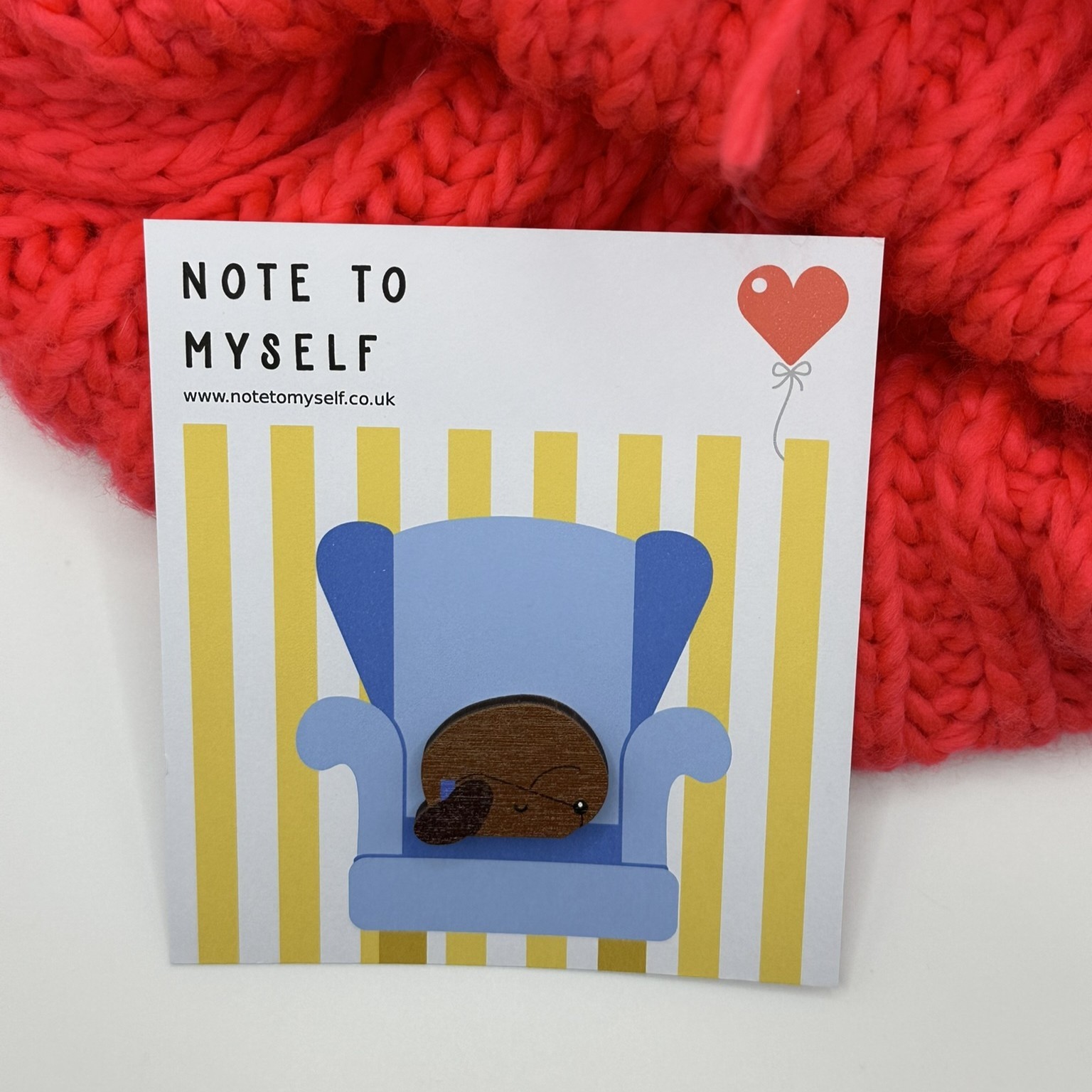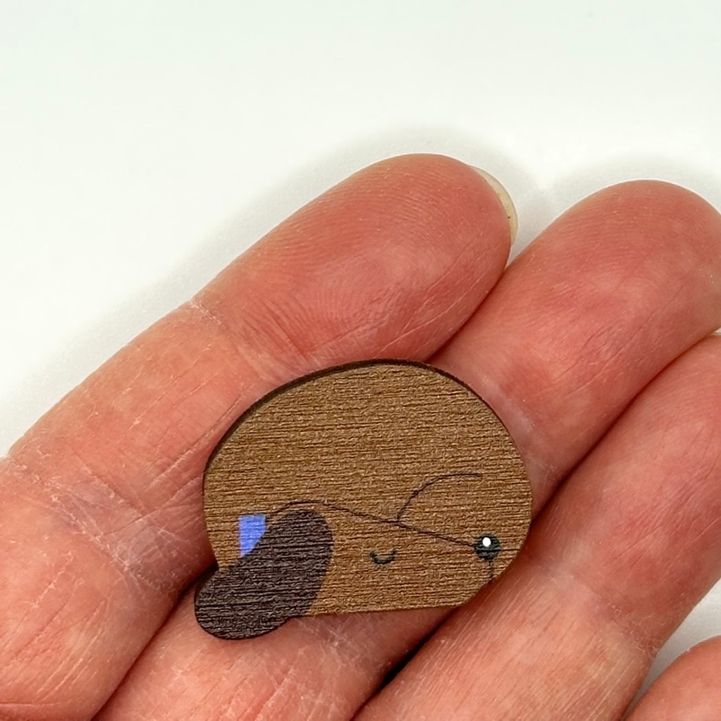 An adorable wooden dachshund pin badge. The pin is made from wood and printed with high quality UV ink. Designed to picture the little dog curled up having a lovely nap. Each pin badge is finished with a metal pin and clasp so it can be attached to a coat or bag. It is presented on a pretty backing card ready to gift to a friend who loves dogs.
