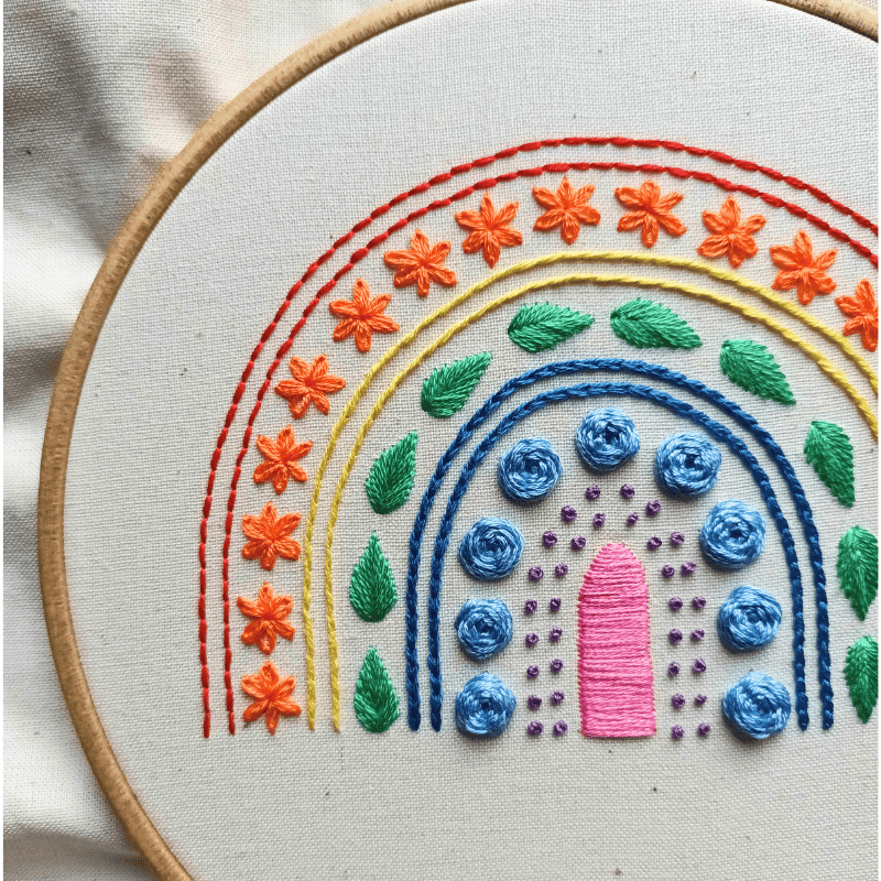 This rainbow pattern is designed to be a stitch sampler so that each element focuses on one specific colour and embroidery technique, making this perfect as a first embroidery project.