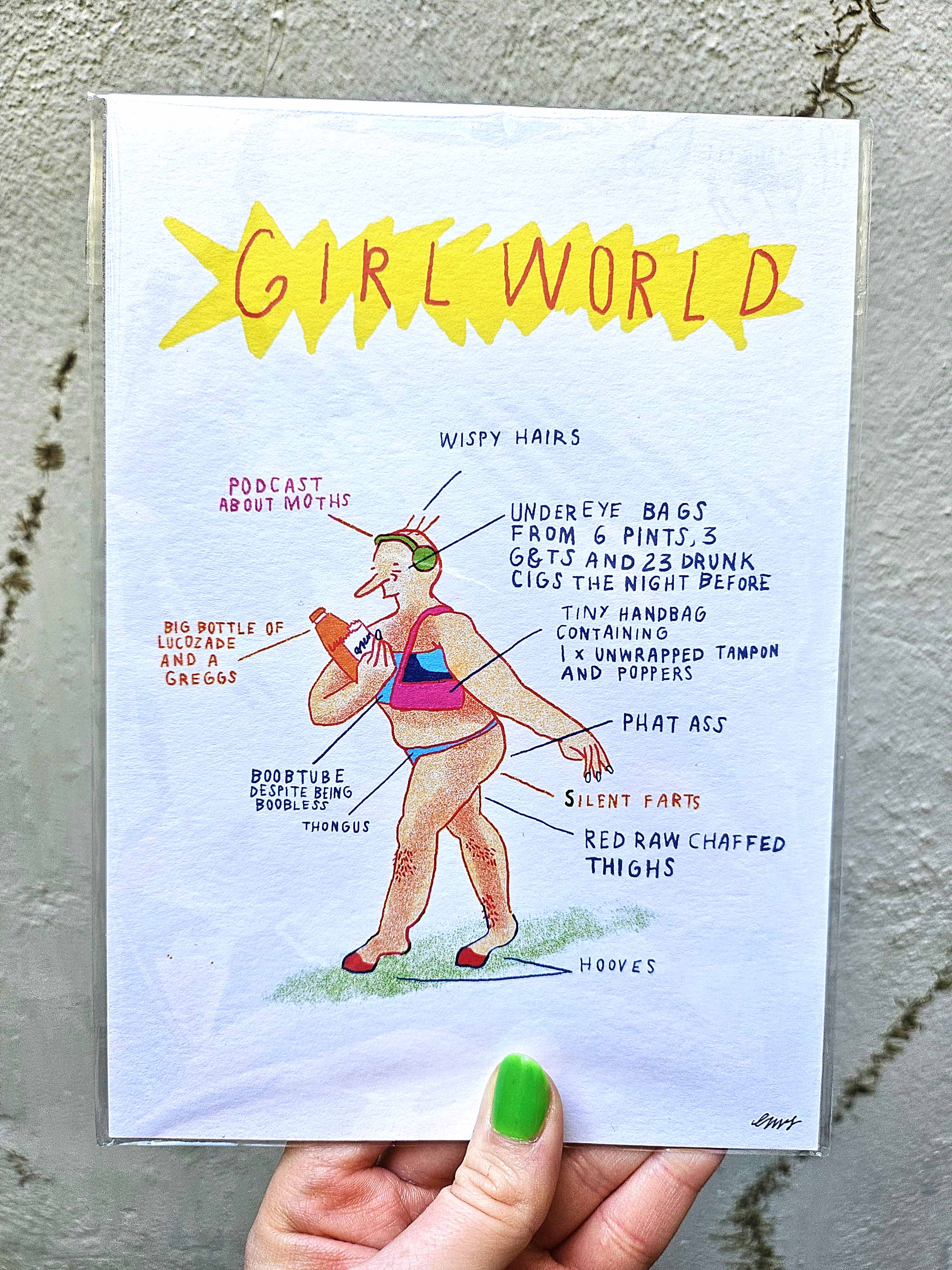 GIRLWORLD is an A5 art print illustrated and created by Louise McFarlane, celebrating the messy, funny, tender and beautifully complicated reality of modern femininity.