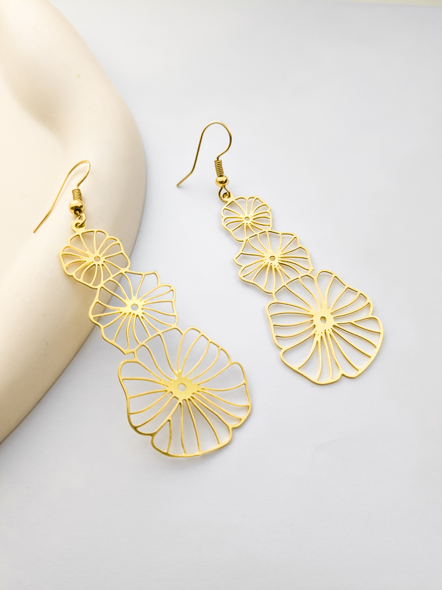Make a statement with our Sara Triple Flower Earrings! These stunning brass earrings feature a trio of delicate flowers, adding a touch of elegance to any outfit. Crafted with care, these earrings are sure to make you stand out and feel confident. Elevate your style with these irresistible statement earrings.