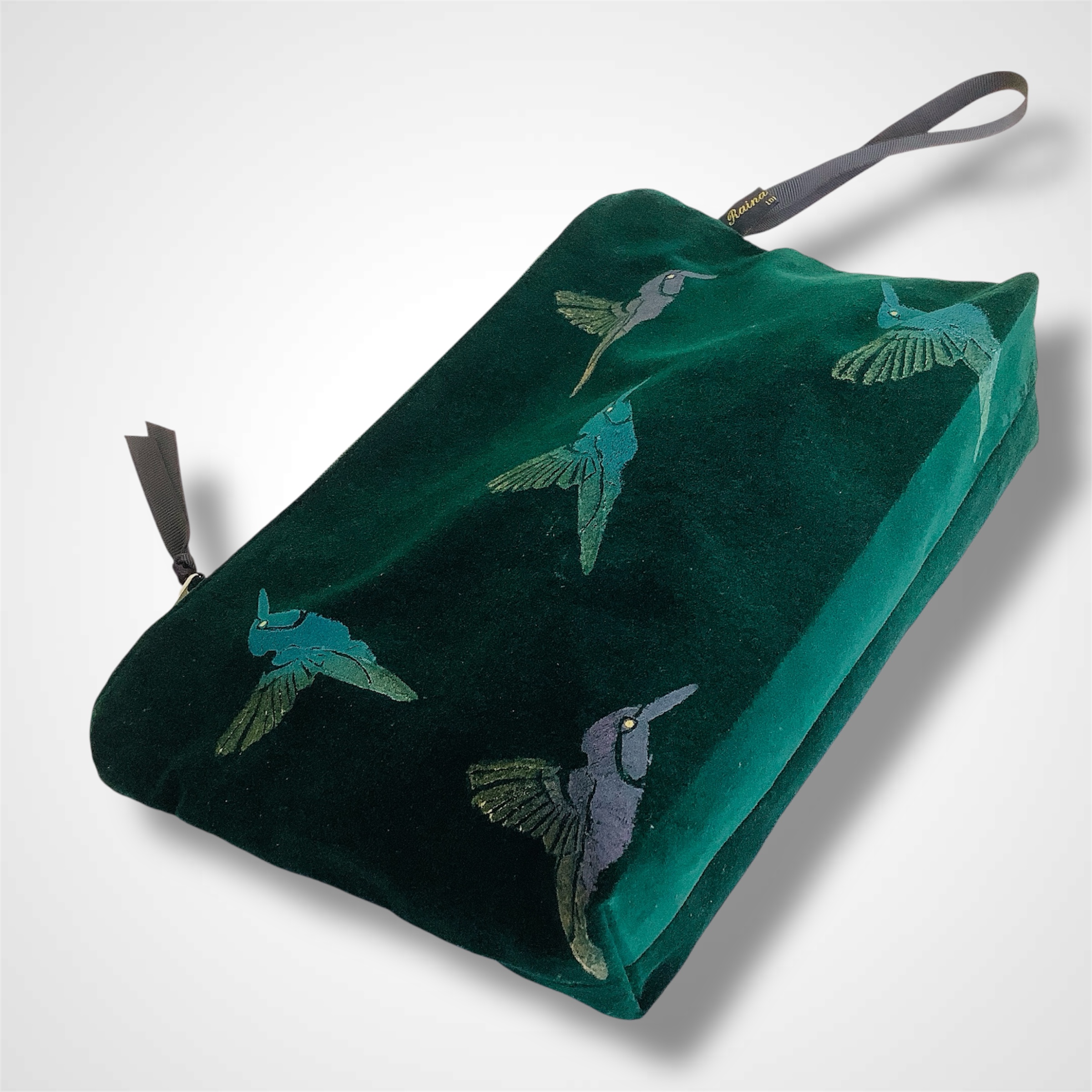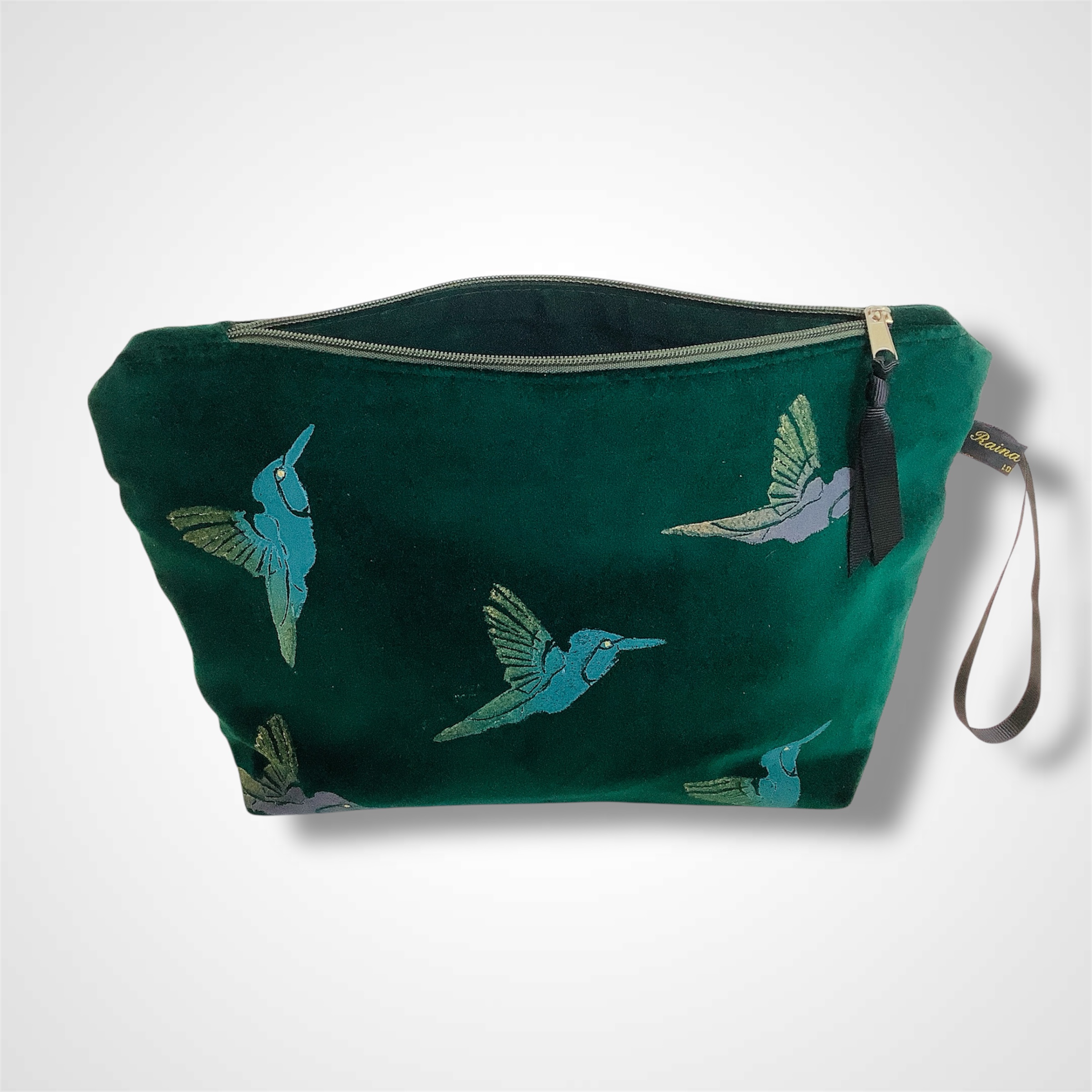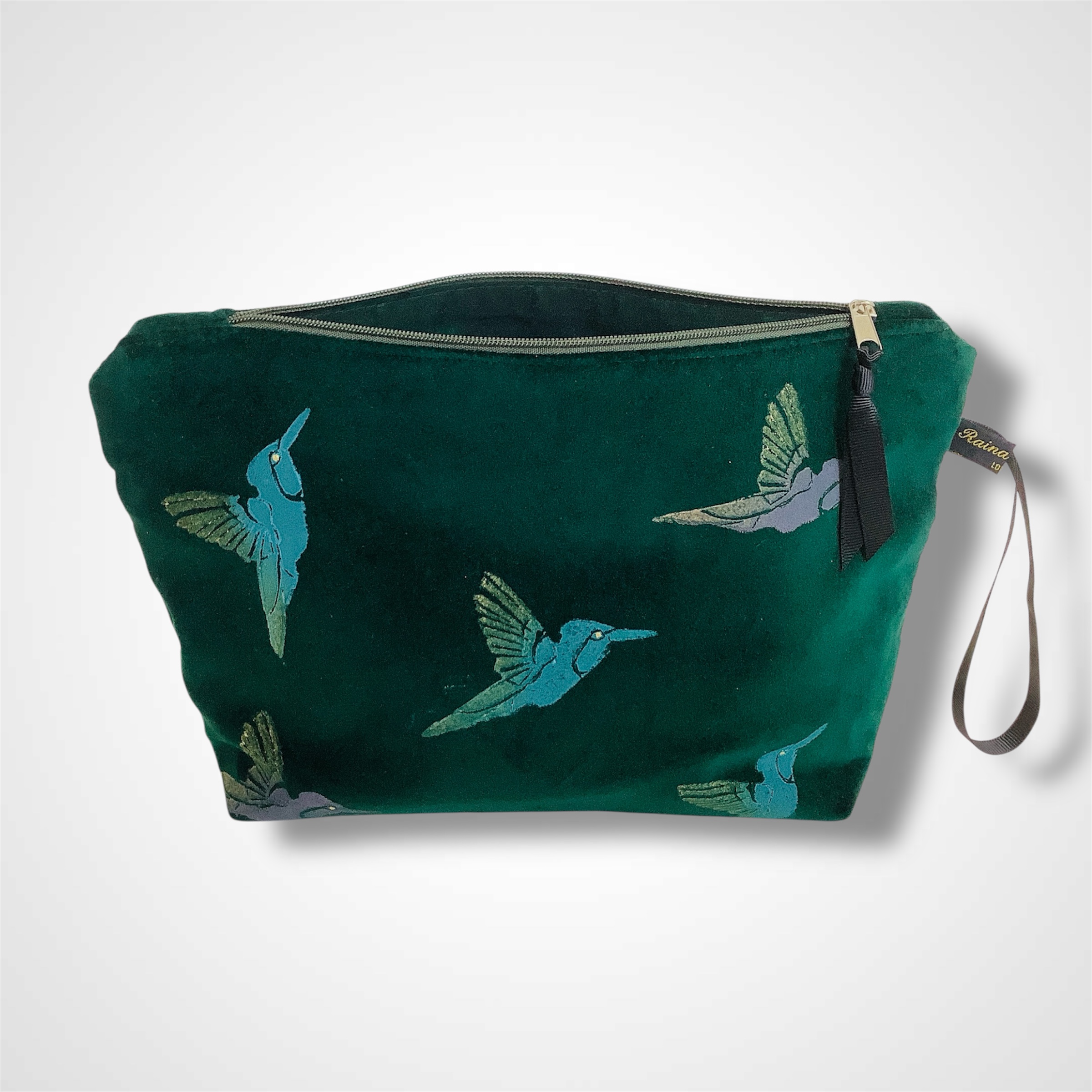 Introducing Raina Atelier Green Hummingbirds Velvet Makeup Bag, an exquisite addition to your daily makeup routine and unique art accessory.