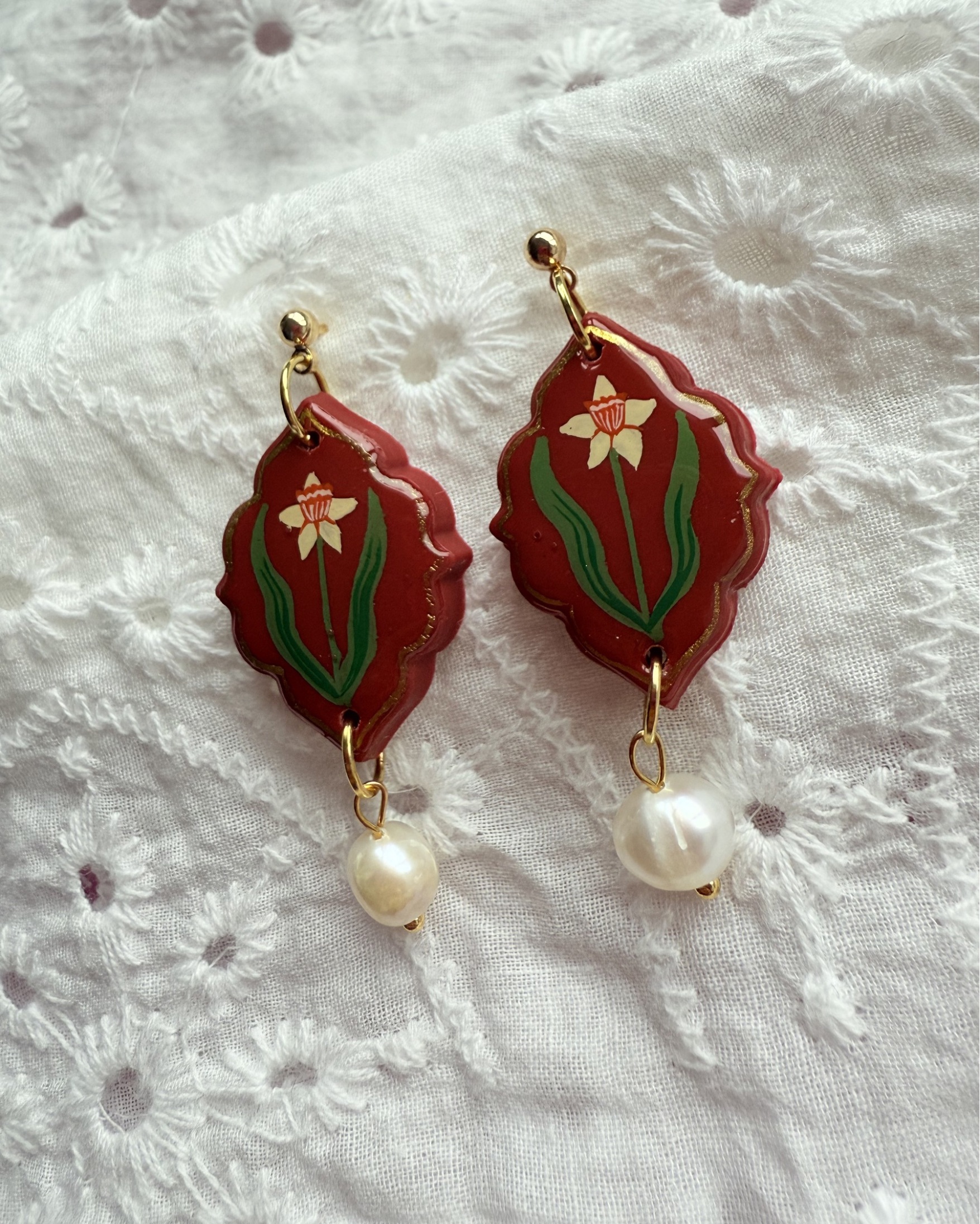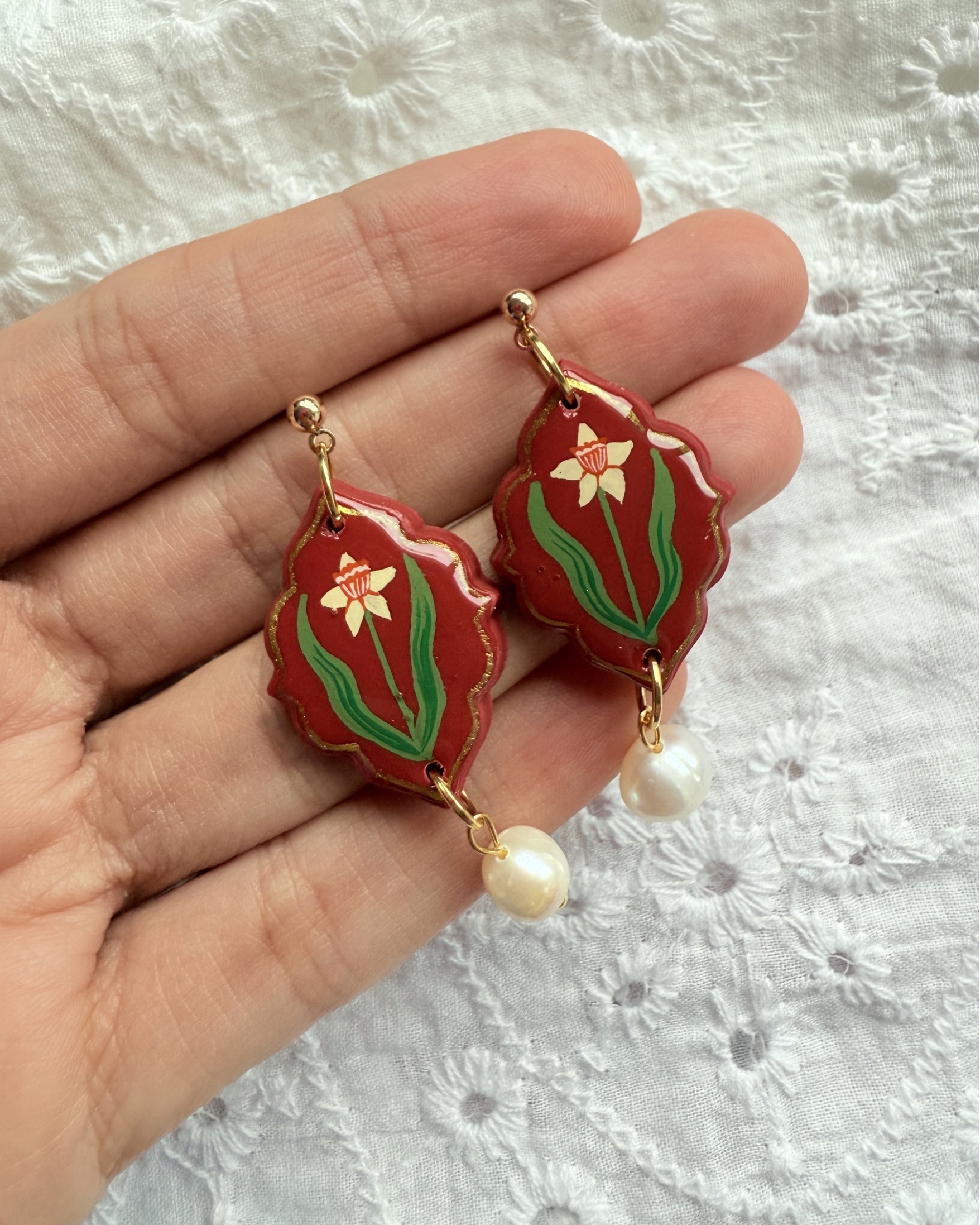 Elegant and timeless, these hand painted daffodil drop earrings feature a delicate yellow daffodil set against a rich red base with a softly scalloped edge and subtle gold detailing.