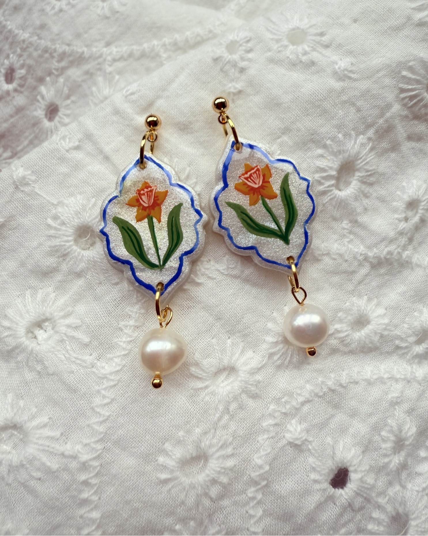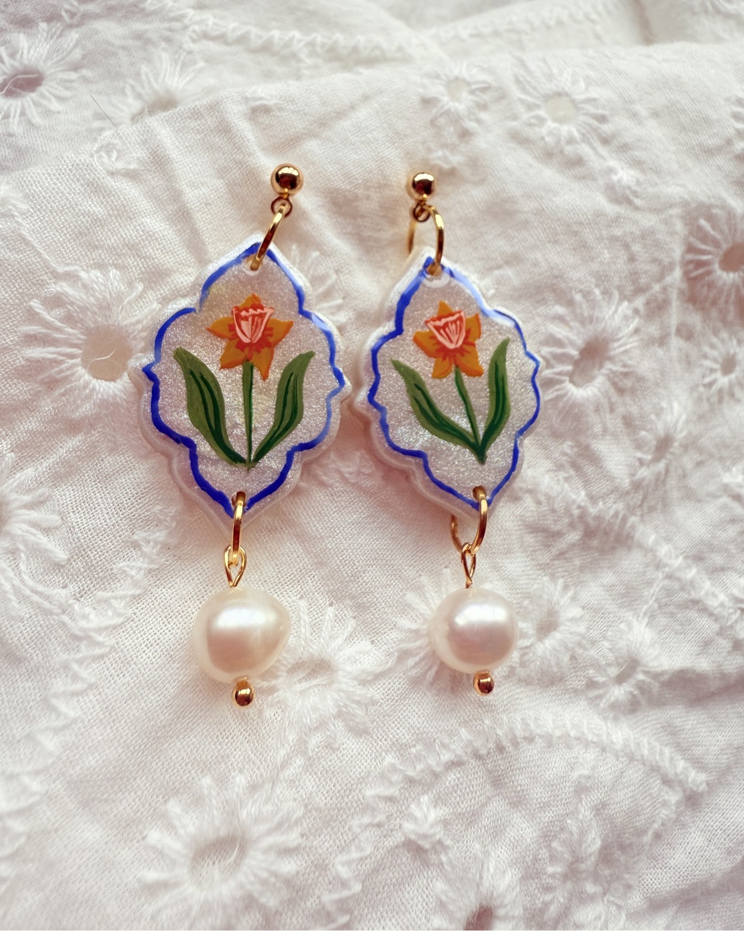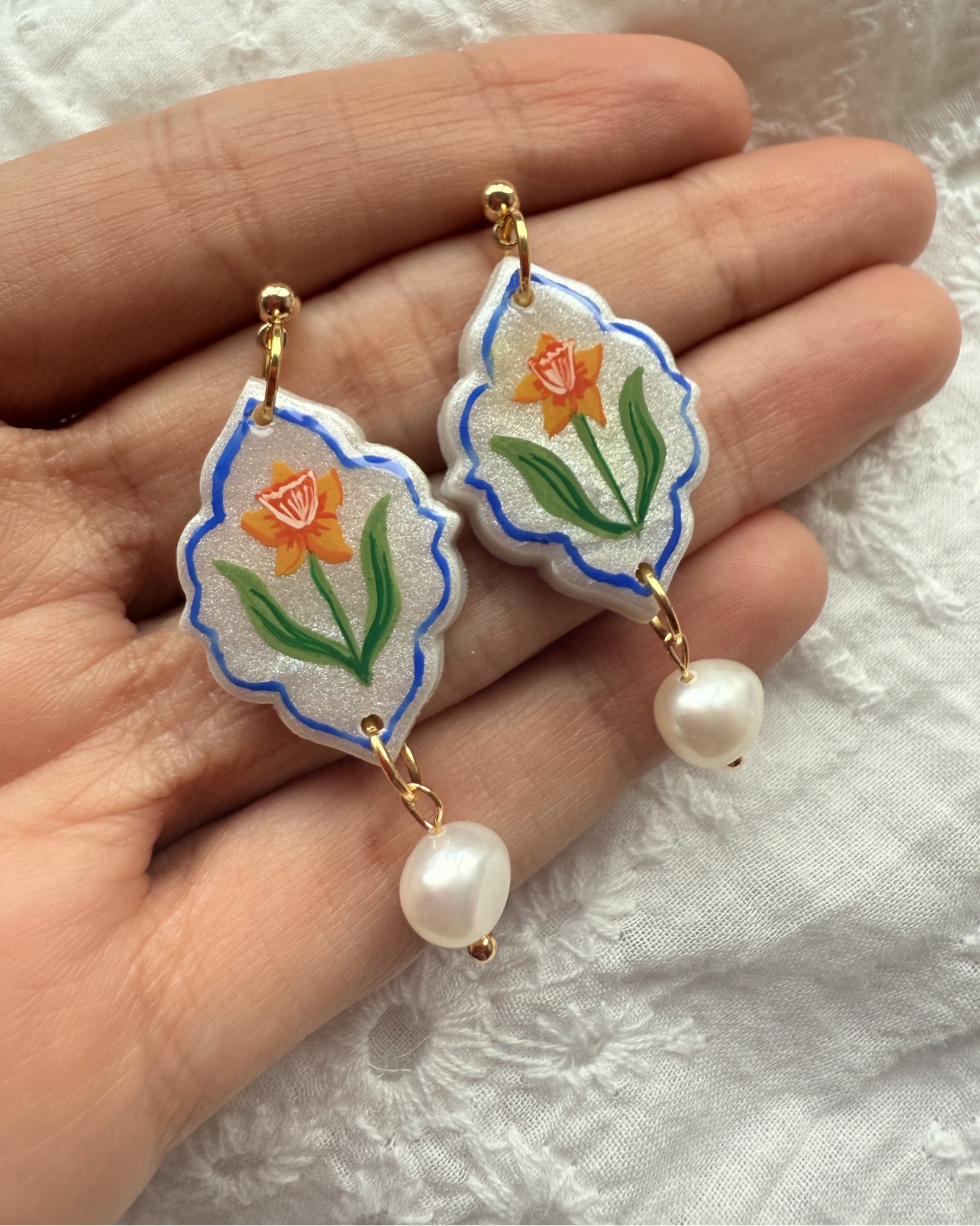 Celebrate the gentle beauty of springtime with these hand-painted Daffodil earrings, carefully illustrated and sealed onto shimmer White polymer clay. Each pair is individually painted, making every piece one of a kind, with soft botanical details that reflect a love of nature and slow craftsmanship.