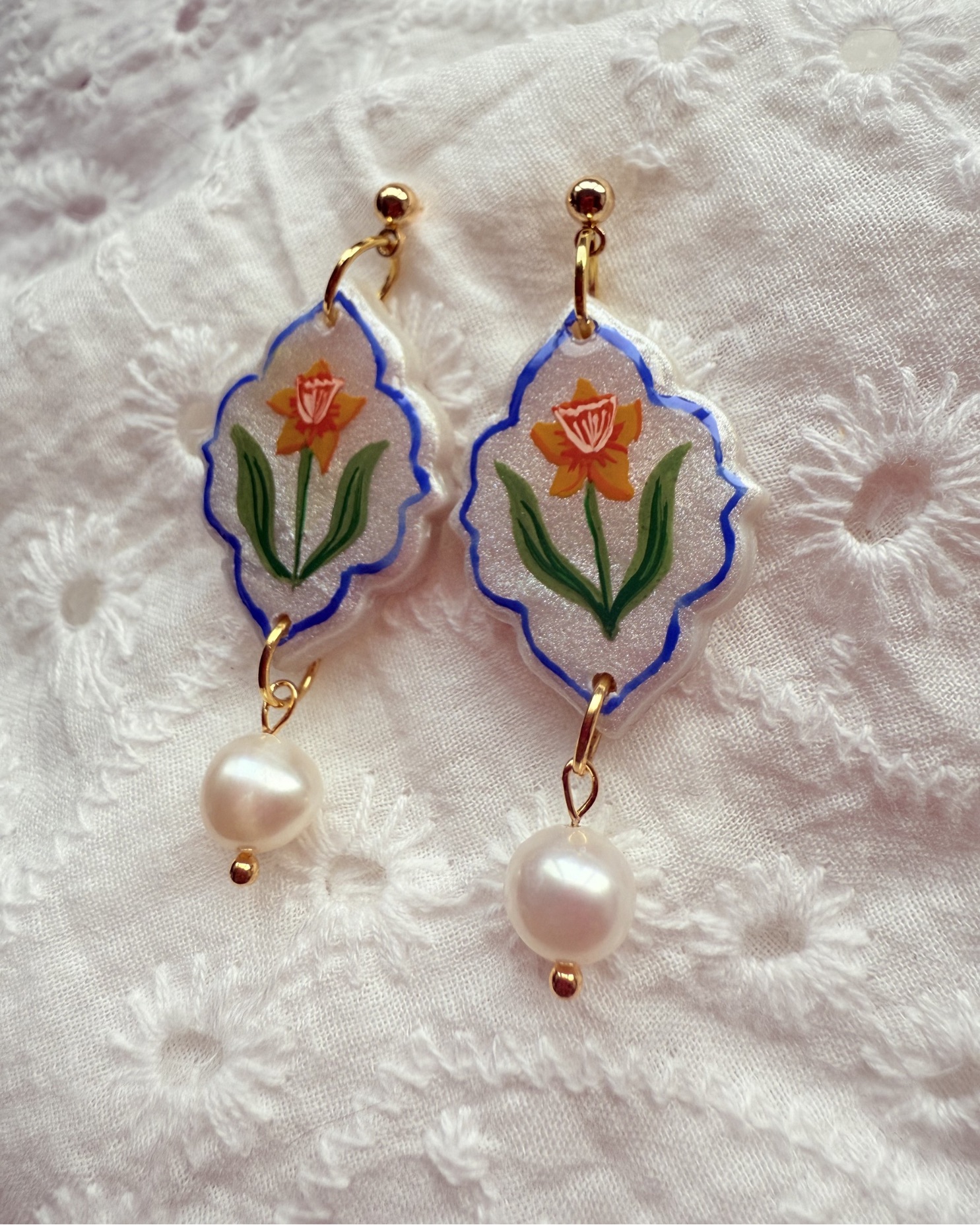 Hand Painted Daffodil Earrings with Freshwater Pearls