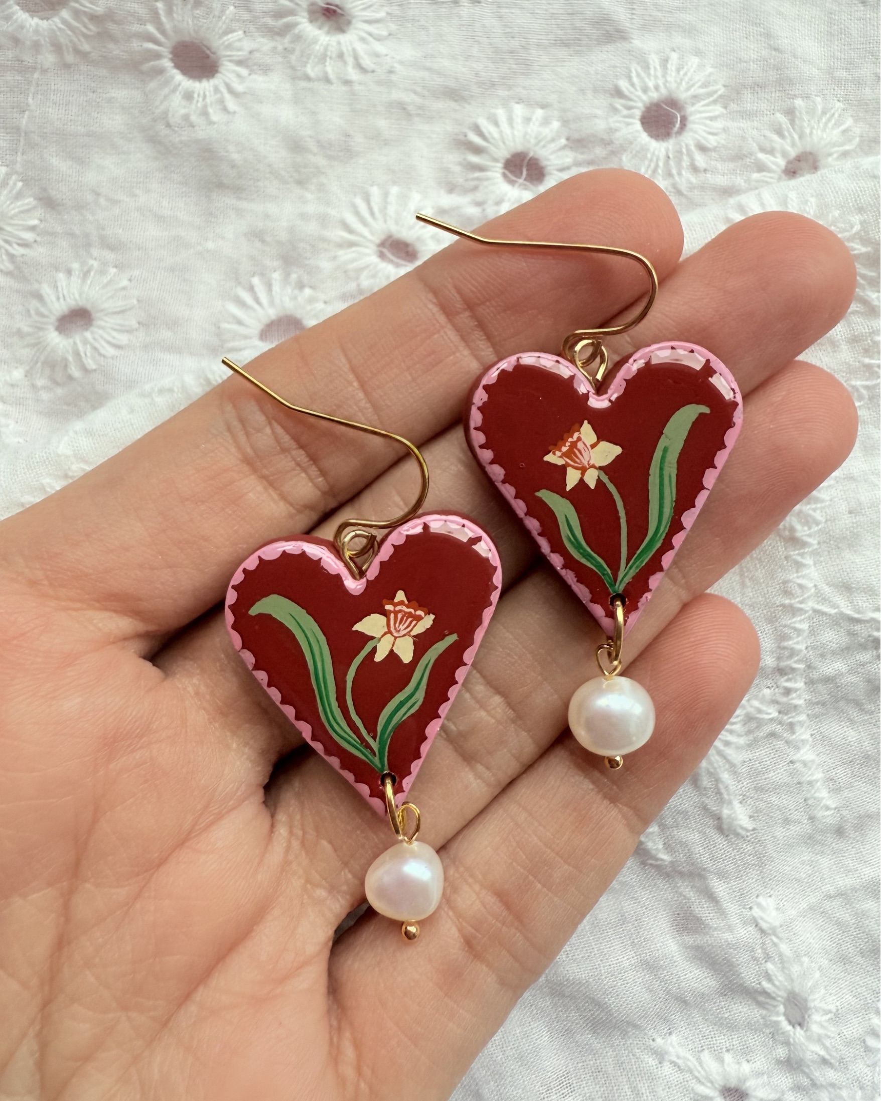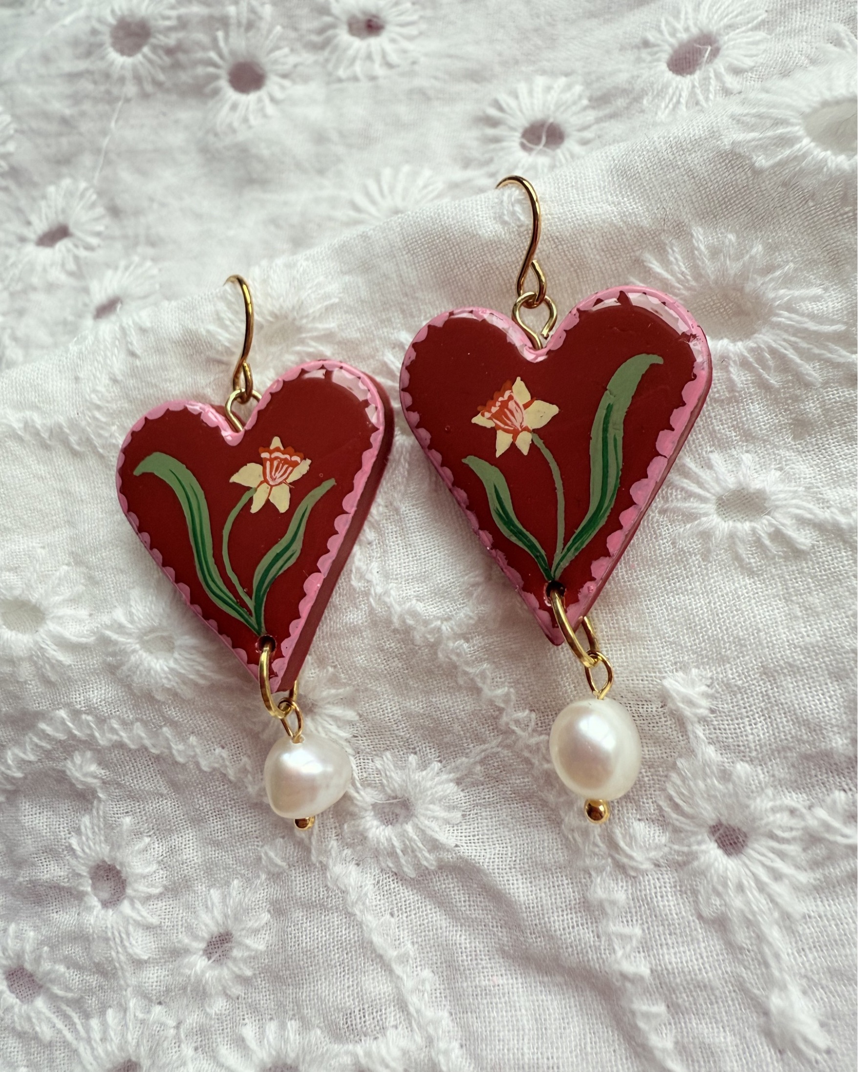 Romantic and botanical, these hand painted daffodil heart earrings feature a delicate yellow daffodil set against a rich red heart background, framed with a soft scalloped pink border.