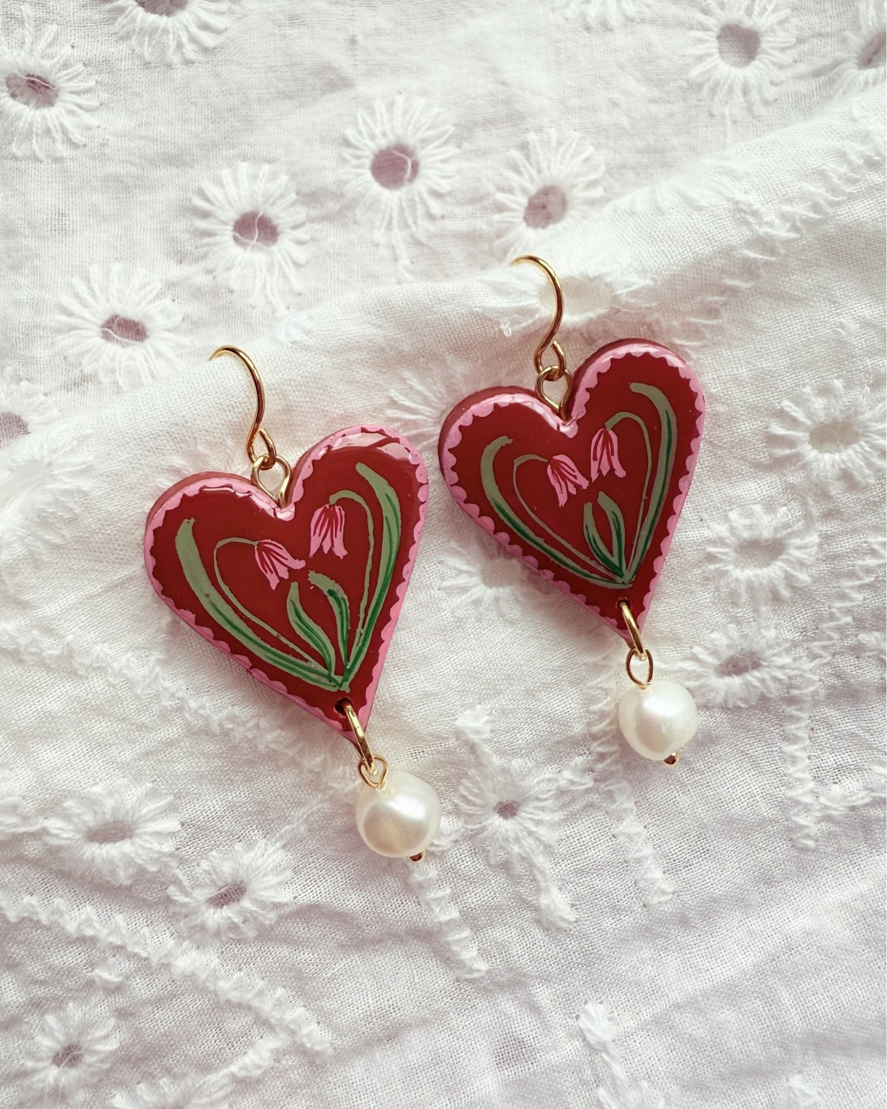 Romantic and feminine, these hand painted heart earrings feature delicate pink florals set against a rich red background, finished with a dainty freshwater pearl drop.