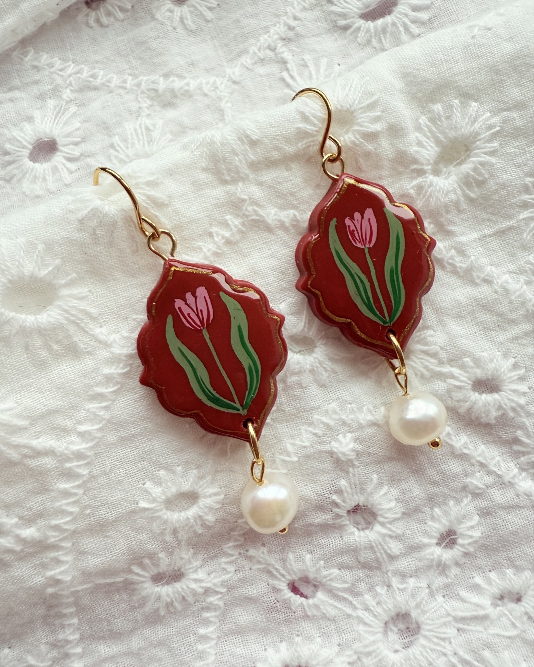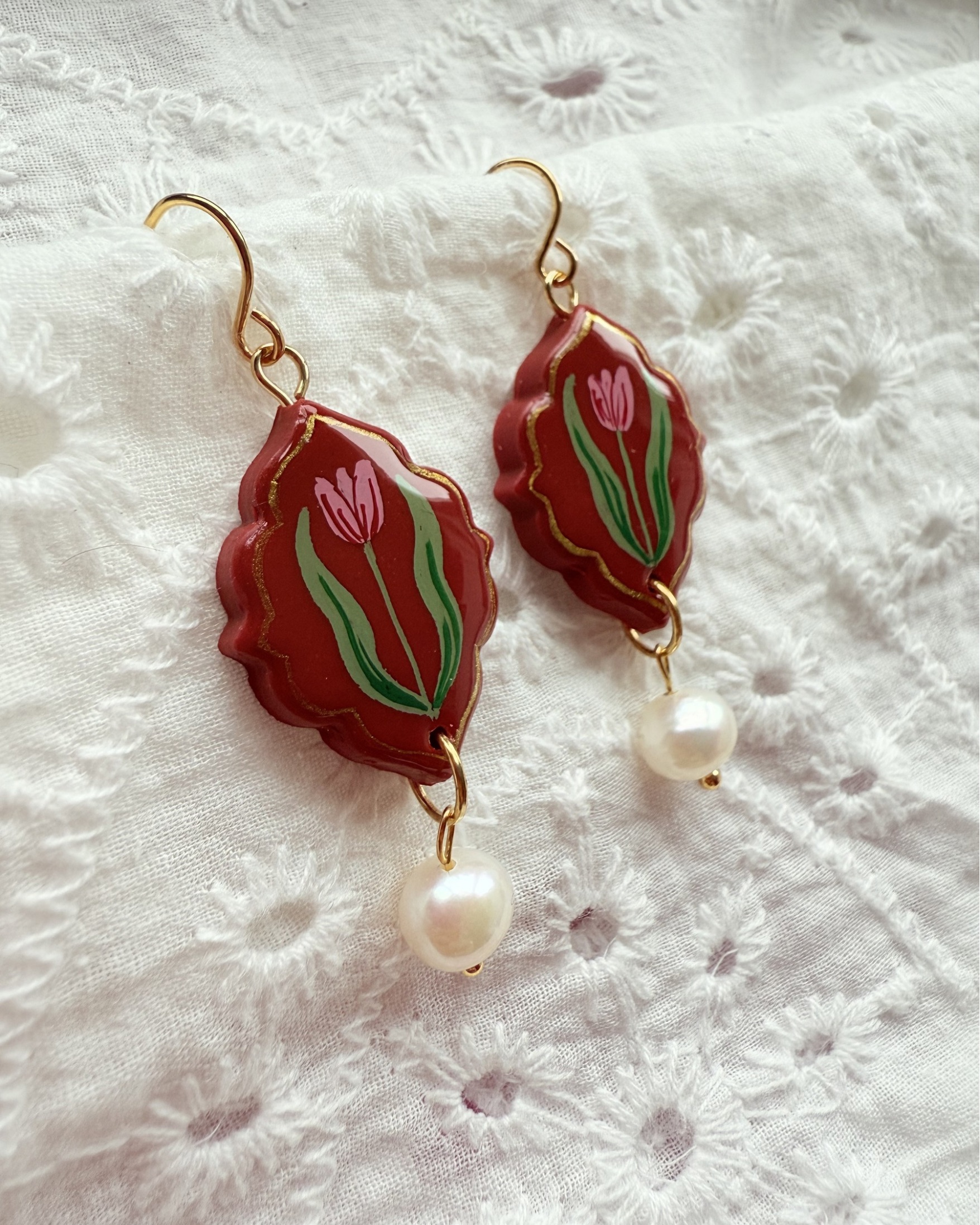 Elegant and romantic, these hand painted tulip earrings feature a delicate Pink tulip illustration set against a rich Red background, finished with a soft scalloped edge and subtle gold detailing.