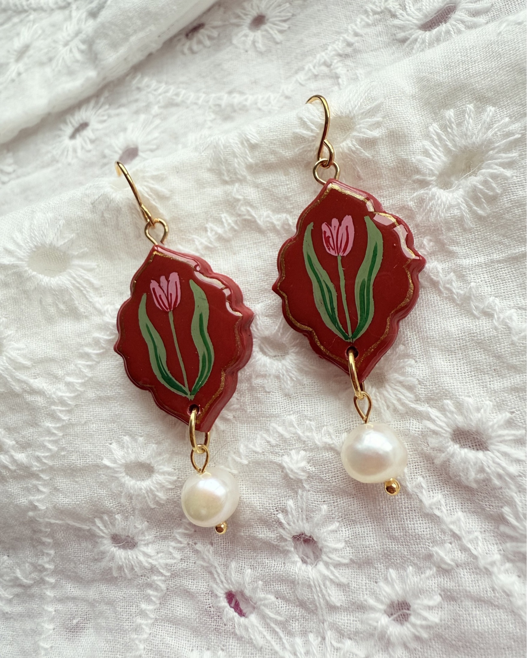 Hand Painted Tulip Earrings with Freshwater Pearl – 18K Gold Plated Floral Jewellery