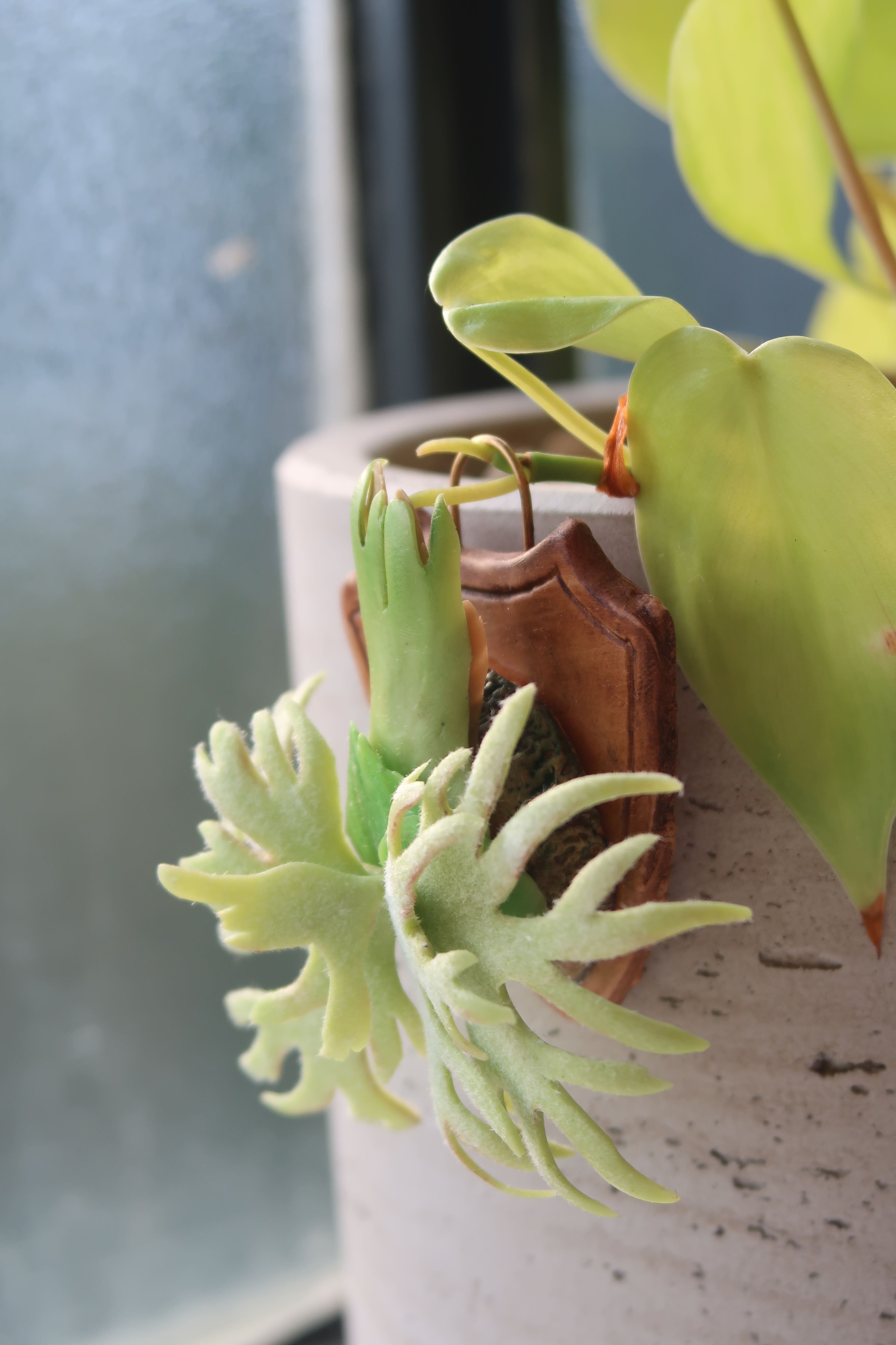 This one-of-a-kind staghorn fern hanging is meticulously handcrafted by an artist using sculpted clay to capture the natural curves and textures of real fern leaves.