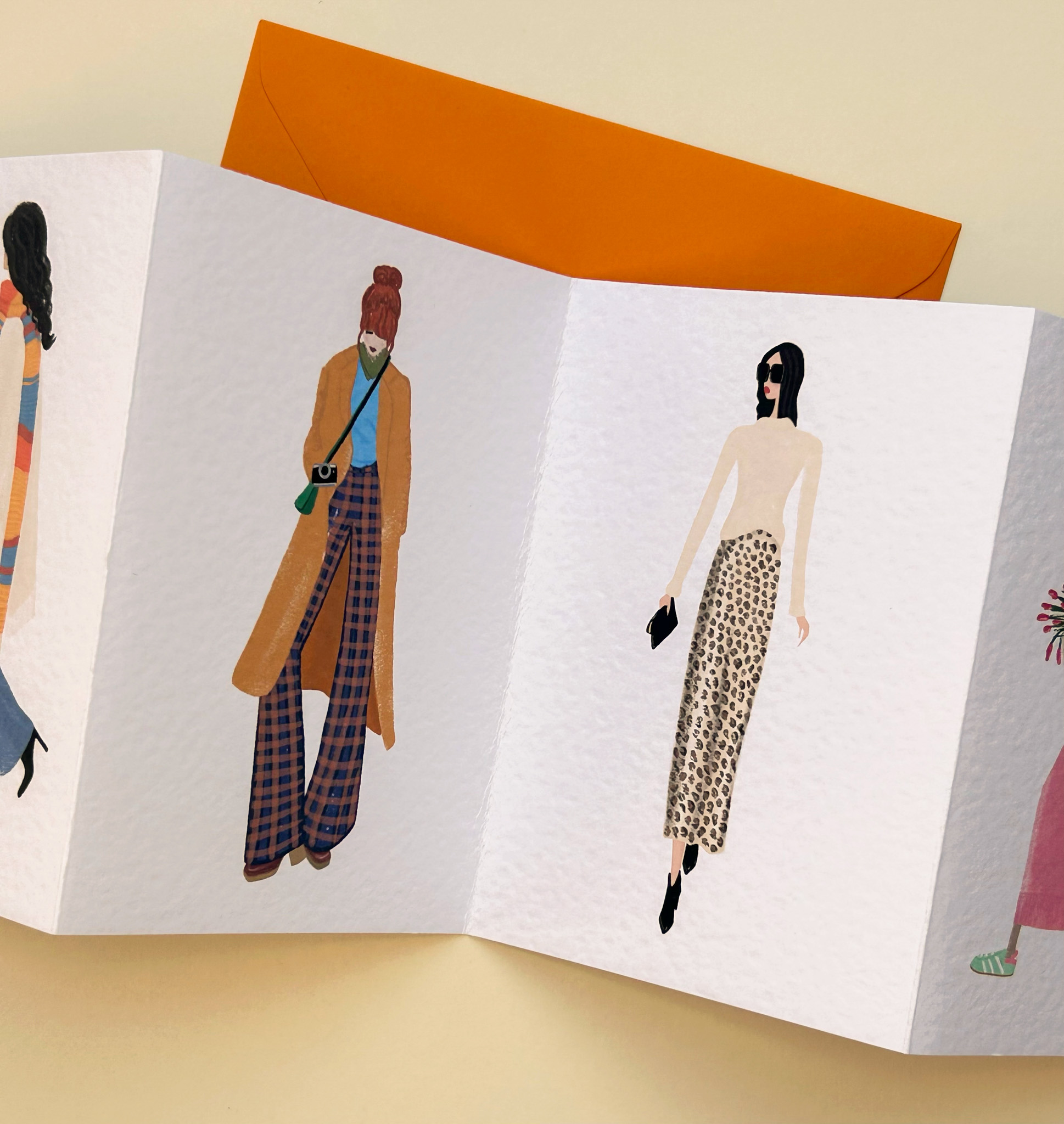 This unique card is perfect for fashion lovers, as a stylish greeting, or even a piece of seasonal decor. Each panel of this concertina-style card displays an illustration which captures the essence of autumn in a playful, fashionable way, making this card a perfect gift for fashion enthusiasts who adore the Fall season!