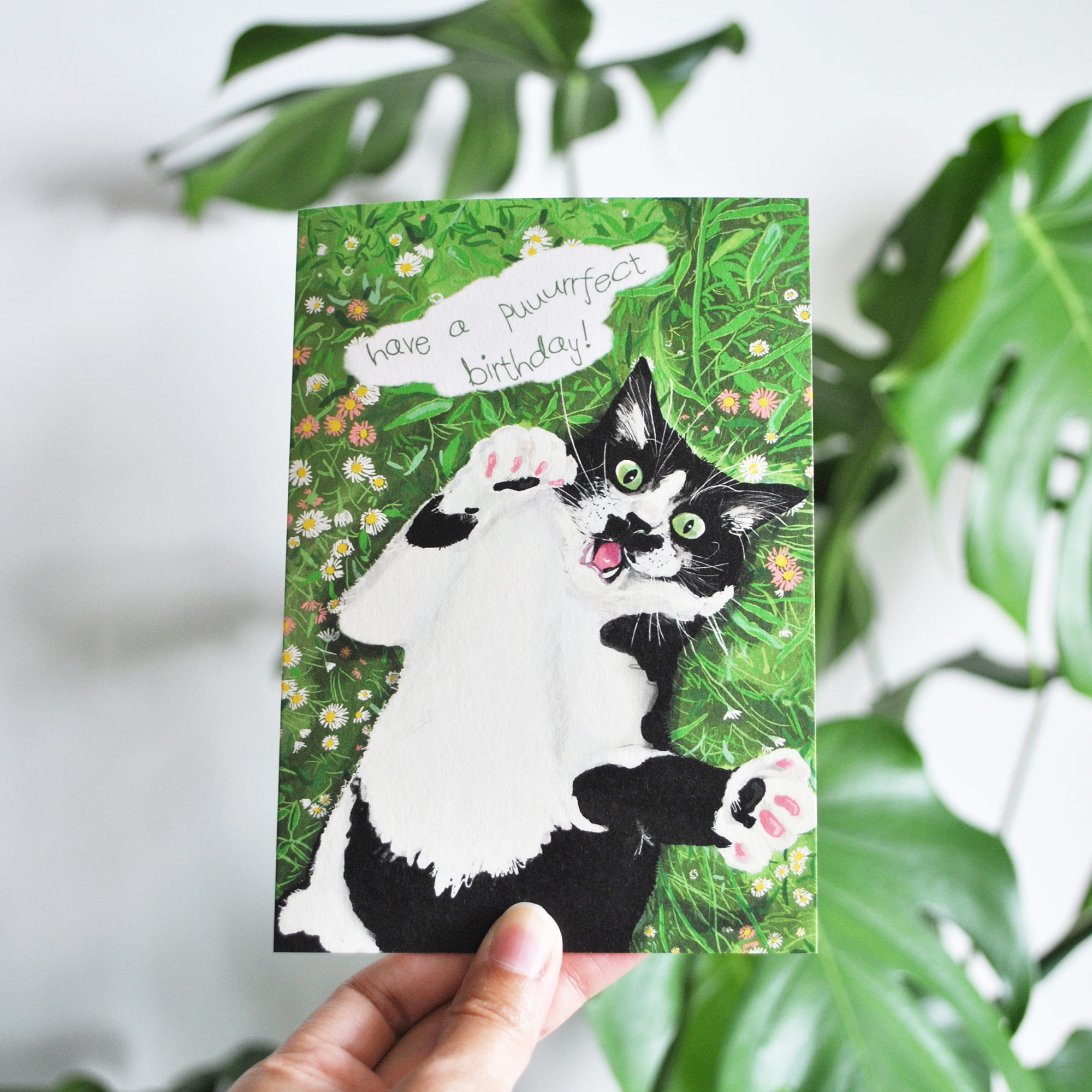 This vibrant and charming A6 card features a delightful design of a black and white cat on a bed of daisies, perfect for a cat lover. Its interior is intentionally left blank, giving you the freedom to craft a heartfelt, personalised message tailored to the recipient.