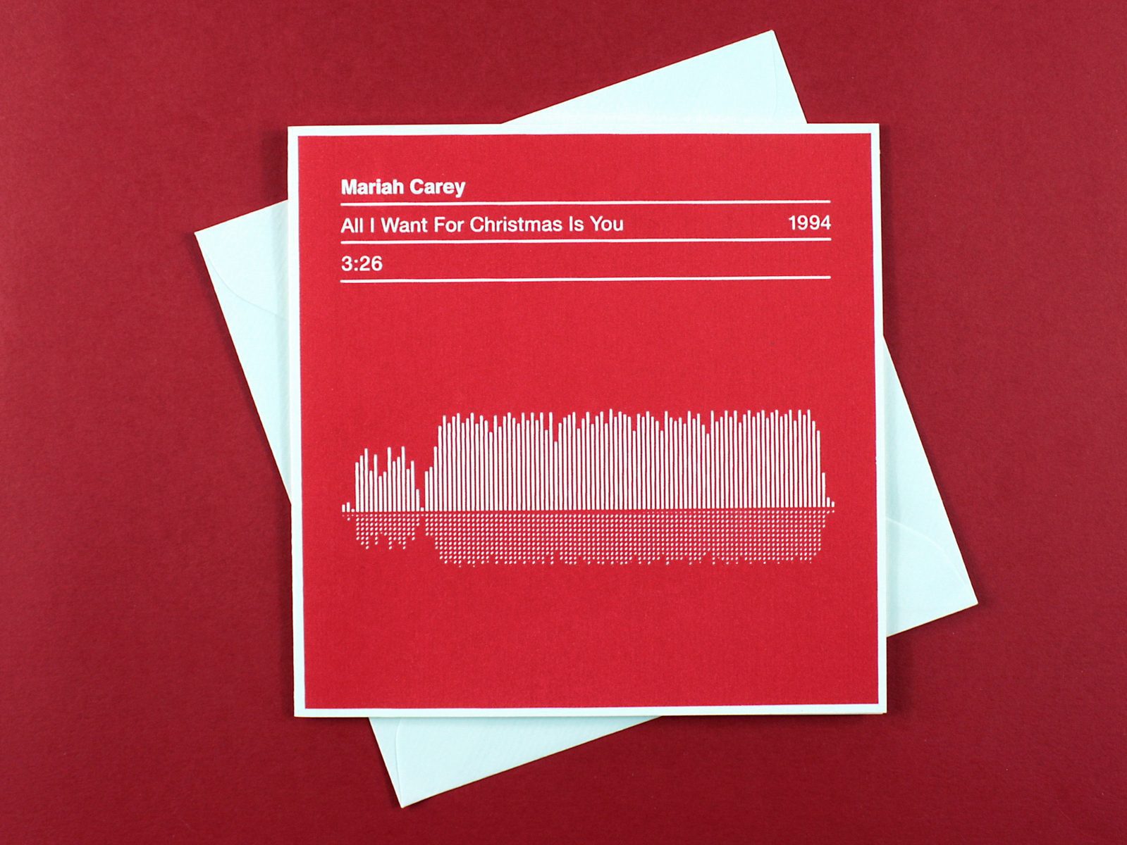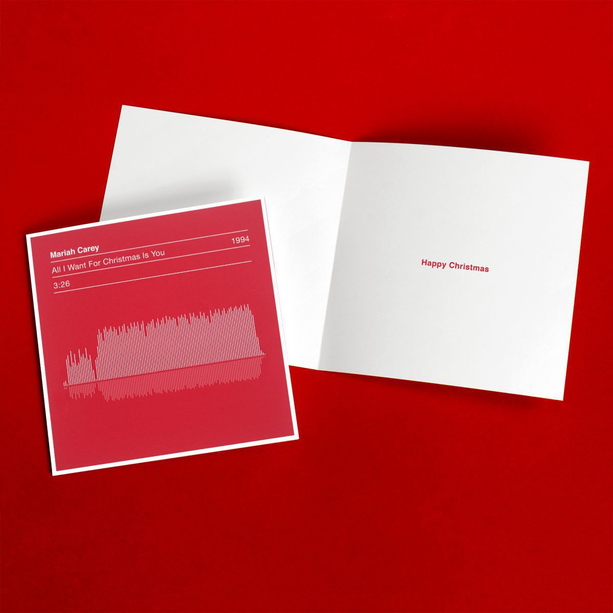 This is a luxury screen printed Christmas card displaying the actual graphic sound wave, along with the song length and release date of Mariah Carey’s classic Christmas song, ‘All I Want For Christmas Is You ’. An deal card for the music lover in your life!
