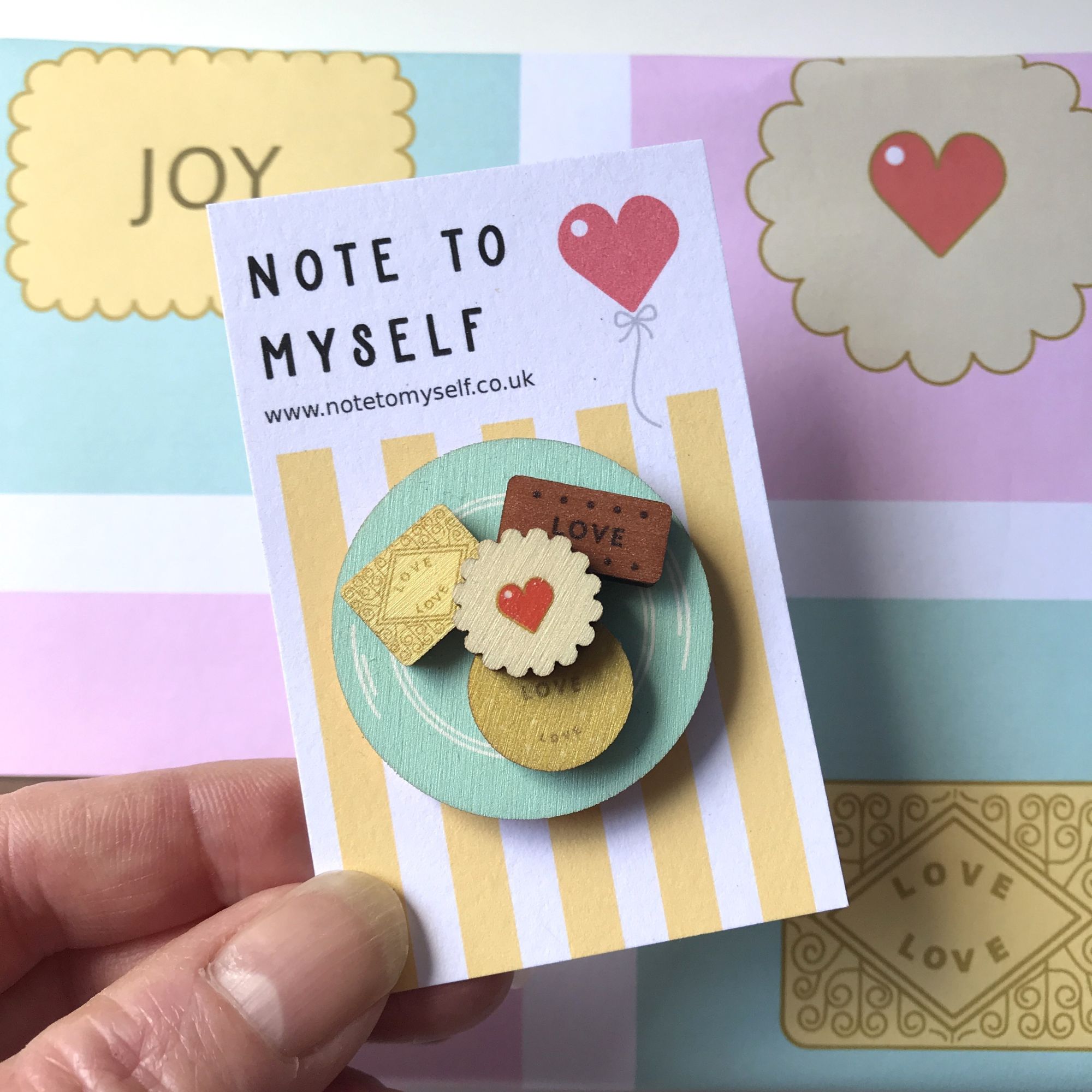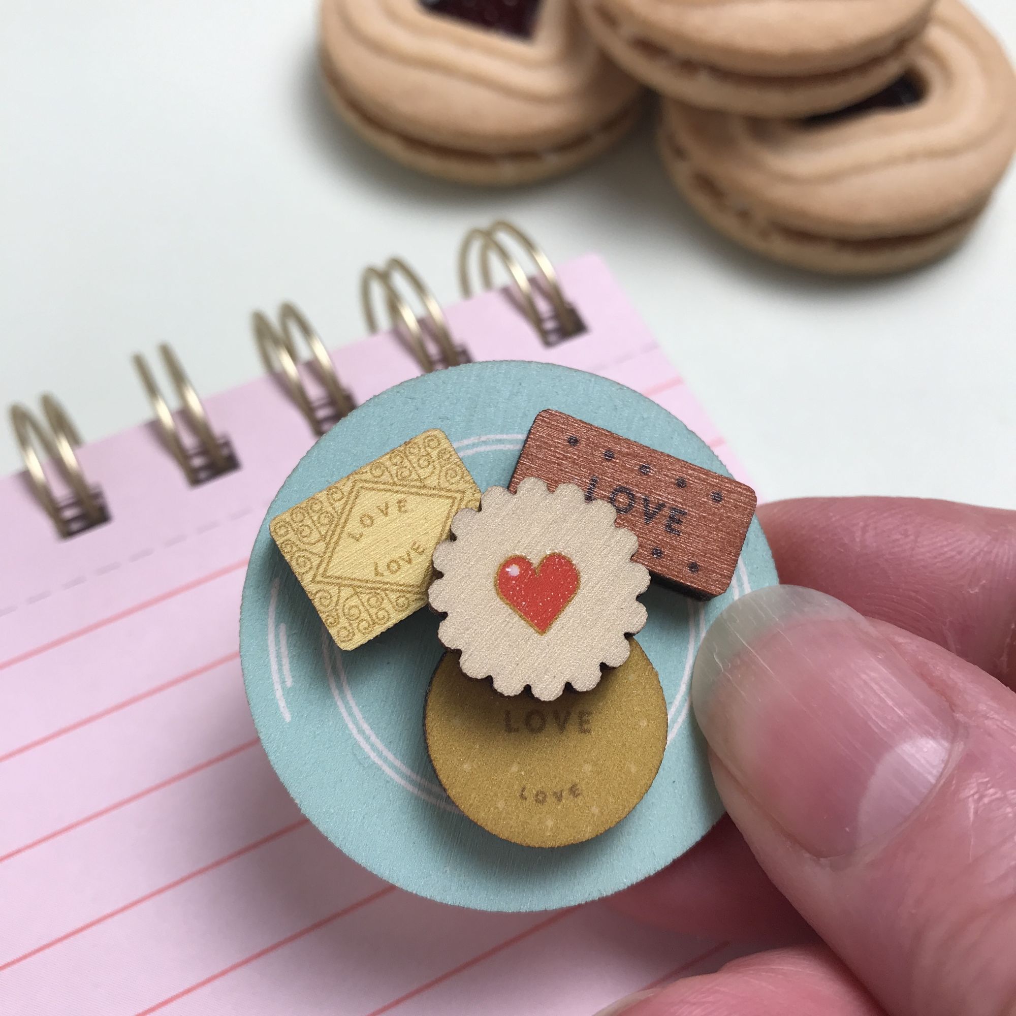 This adorable wooden brooch is made in the design of a mini plate of tea time favourite biscuits. On the plate are a mini digestive, custard cream, bourbon and in the middle a jam heart biscuit. I love to add little details to my designs, and this one has the word “Love” on the biscuits. It is made from wood and printed with high quality UV ink. On the back is attached a metal pin badge bar.