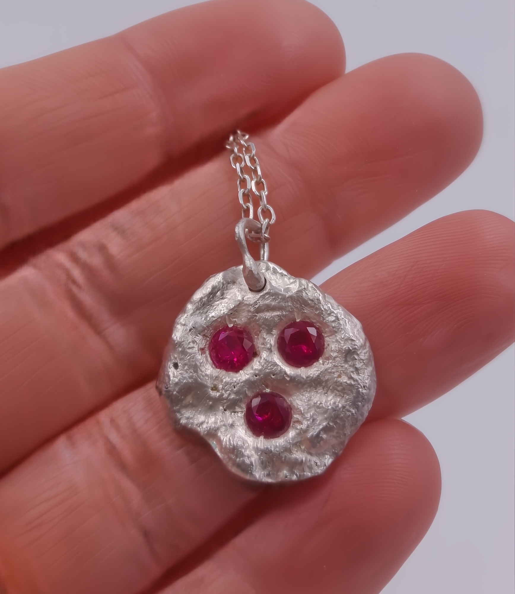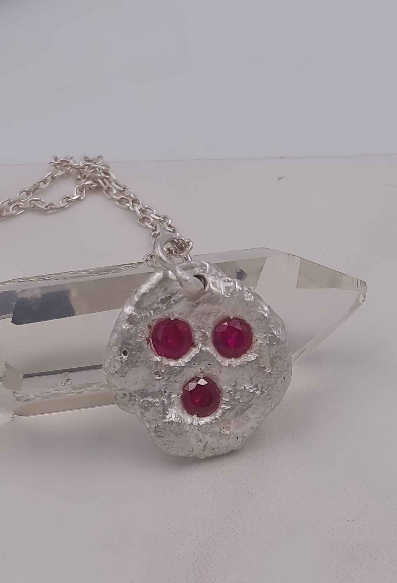 Nestled within the silver’s fluid embrace are three vibrant synthetic ruby gemstones. Their deep crimson hues adding a touch of passion and elegance to the piece. Suspended from a delicate yet durable sterling silver chain, this pendant is perfect for those who appreciate artisan craftsmanship and timeless beauty.