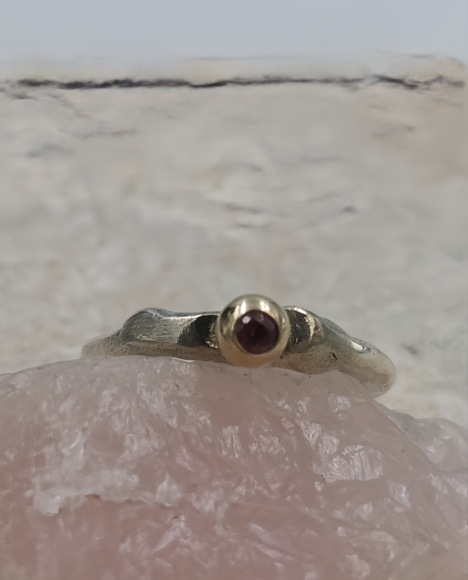Be the first to review “Molten Silver Pinky Ring with Gold Granule and Garnet”