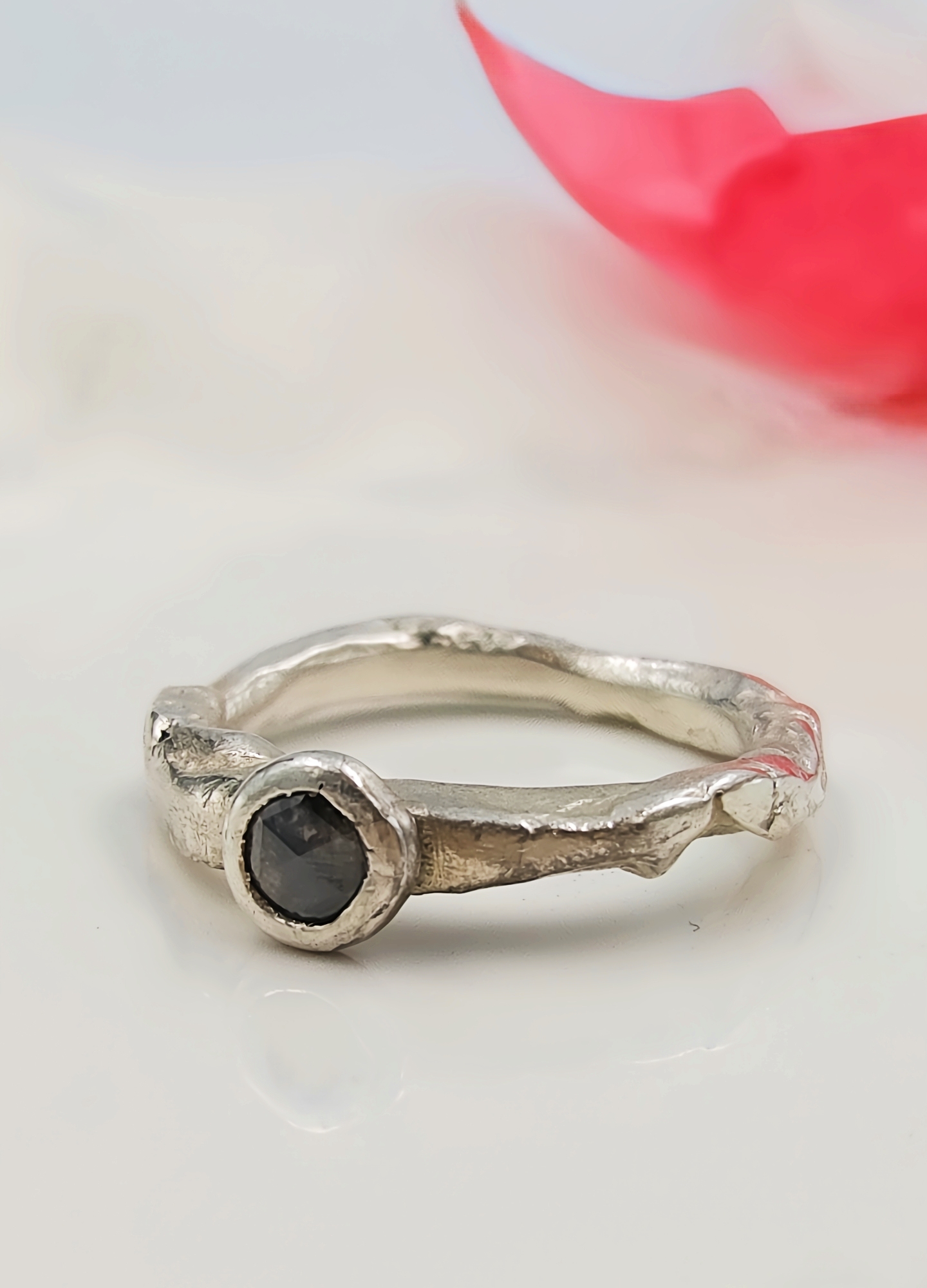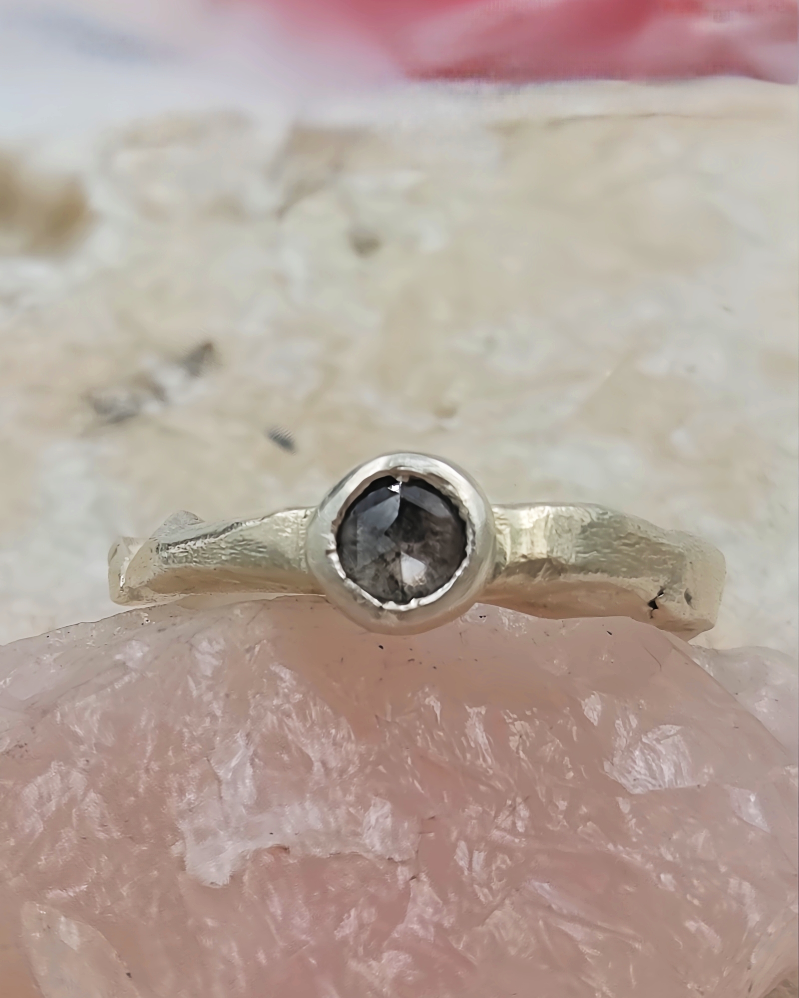 A one-of-a-kind 4.6mm rose cut salt & pepper diamond set in molten recycled silver. Unique, handmade engagement ring full of natural, organic beauty.