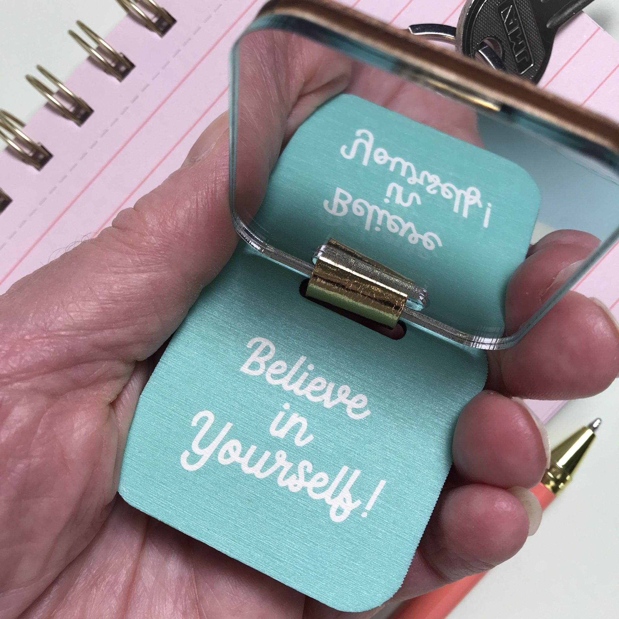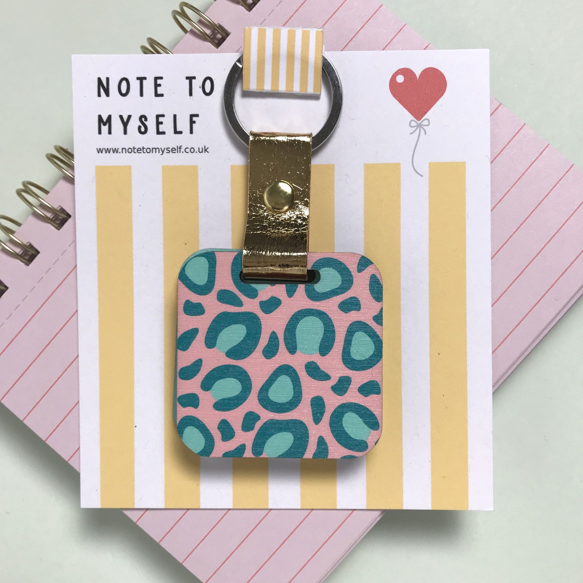 A colour pink and teal leopard print wooden keyring. Open the keychain to reveal the uplifting message “believe in yourself” and a handy pocket mirror.