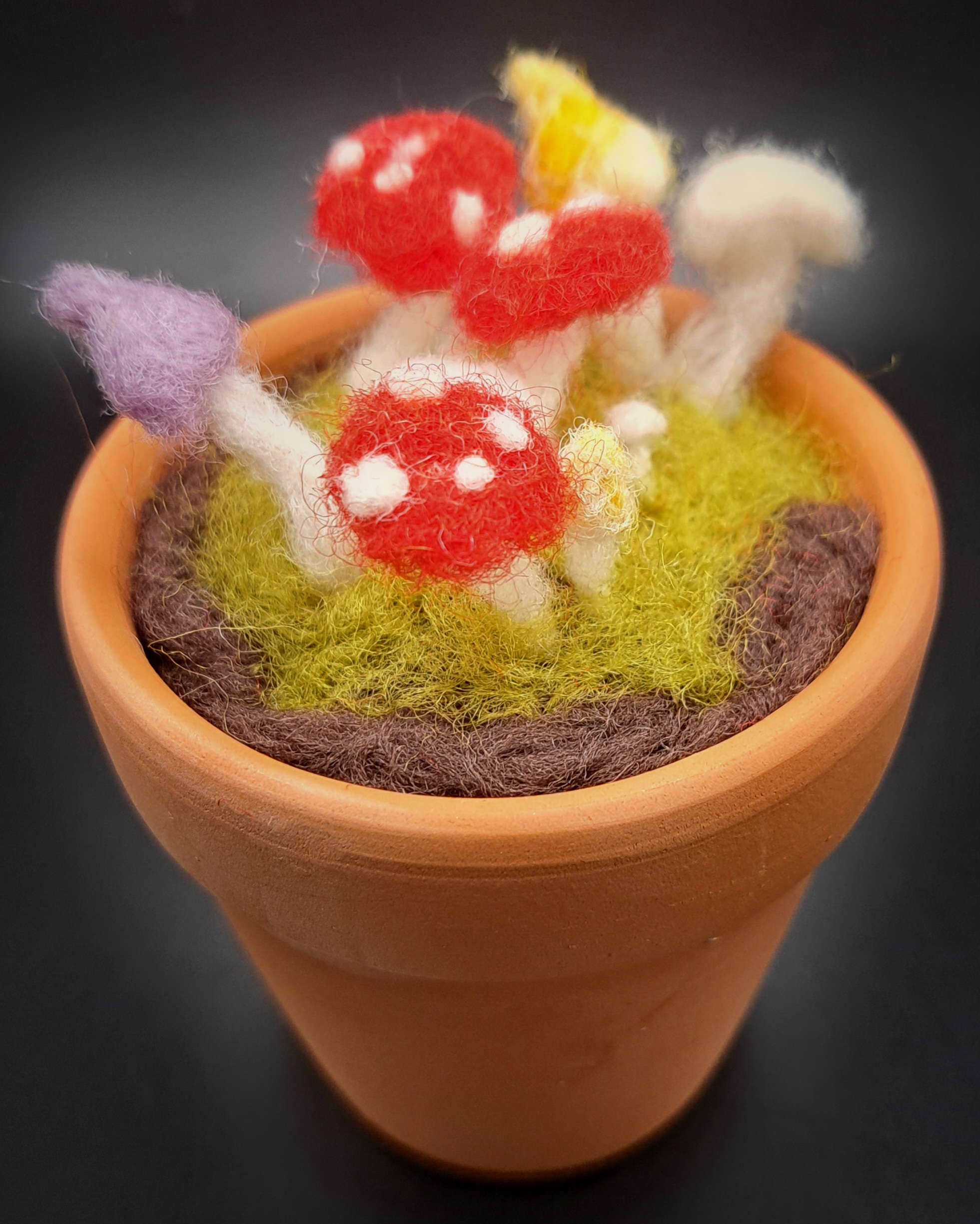 Nestled within the humble curve of a terracotta pot, this needle-felted mushroom arrangement invites the viewer into a quiet, imagined woodland where craft and contemplation meet.
