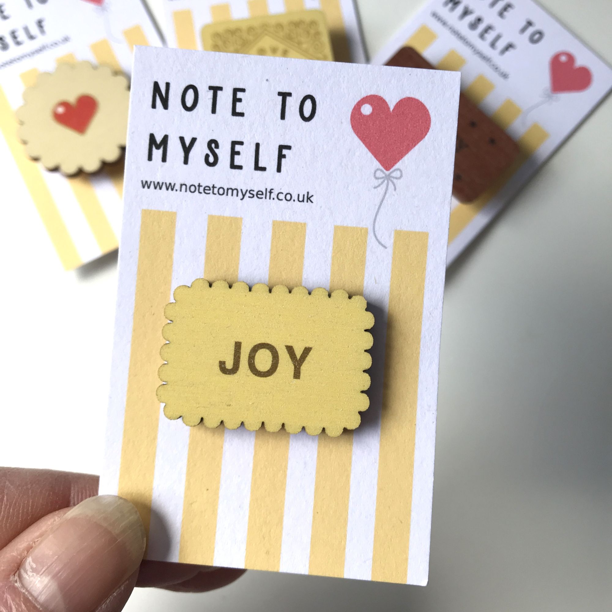 My brooch as a little twist on the original design with the word “Nice” being replaced with the word “Joy”. This is a lovely gift to lift a friend or to buy for yourself. Each pin badge is made from wood and printed with high quality UV ink. On the back is a metal pin and clasp and it is presented on a colourful backing card ready to gift.