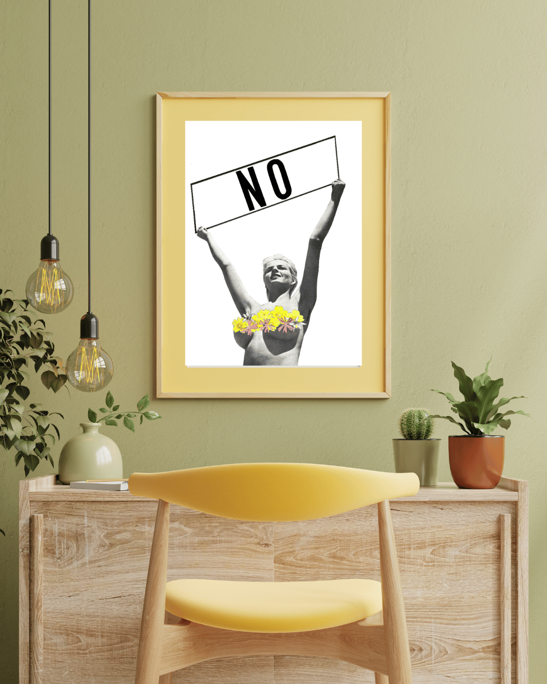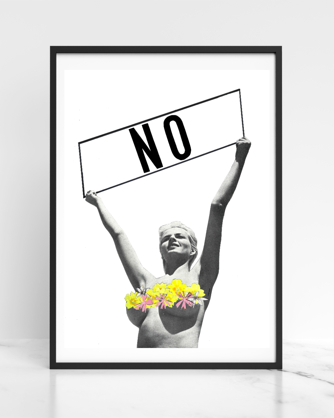 No is a hand-cut collage print by London-based artist Steph Assez. At its heart, it’s a feminist statement — a celebration of boundaries, confidence, and female rebellion. The bold “No” is a full sentence, unapologetic and empowering.