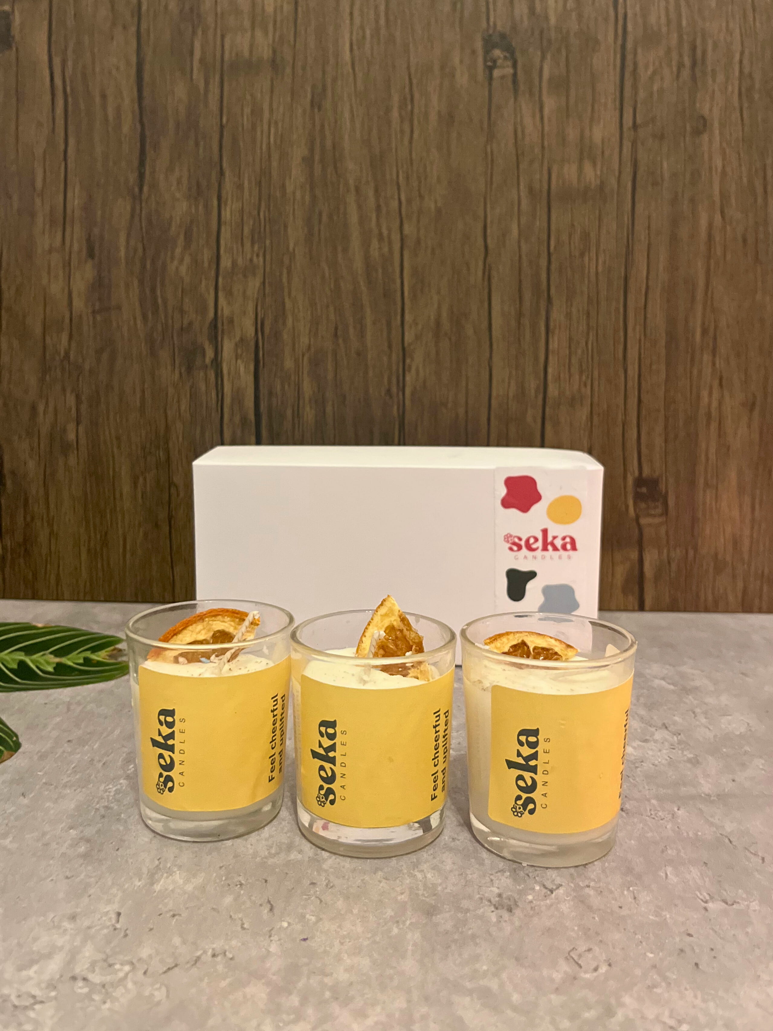 On each candle is a quote reminding you of the benefits of the essential and fragrance oils in our candles. Each quote guides you to these benefits. Our candles are beautifully packaged in a gift box presented with recycled tissue paper, therefore perfect to give as a gift or to treat yourself!