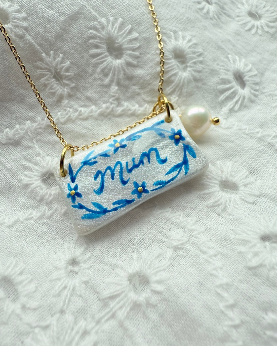 A delicate rectangular pendant necklace, hand-painted with care and personalised with a name that holds meaning — Mum, Mama, Nan or another chosen word.