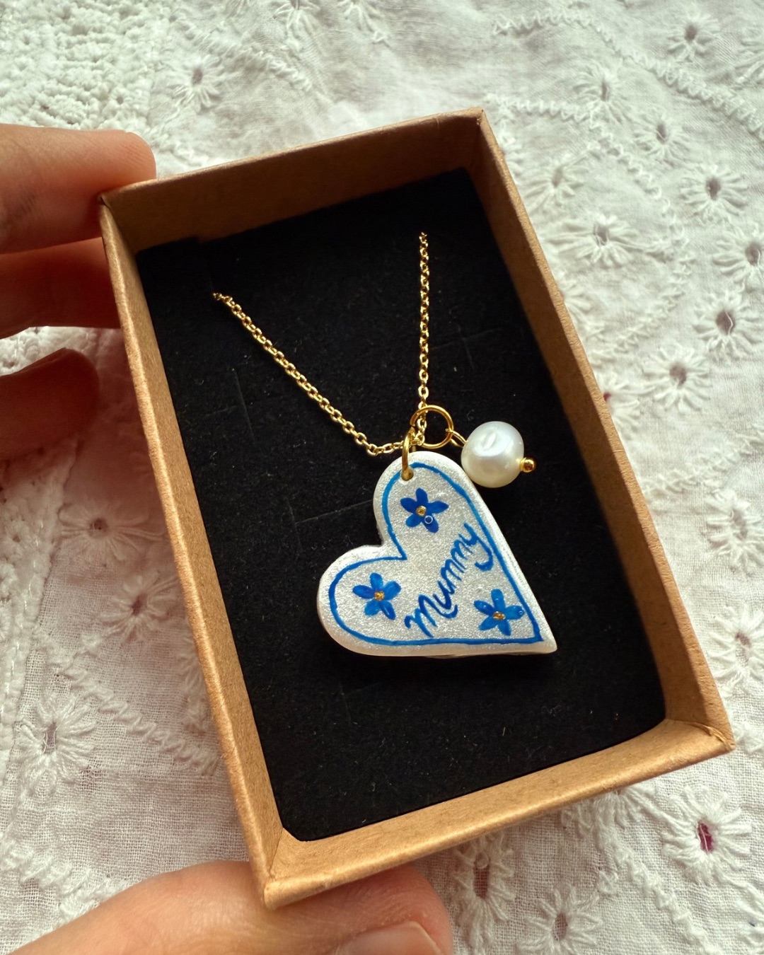 This delicate heart necklace is hand-painted and personalised with a name that feels most natural — Mum, Mummy, Mama, Nan or another chosen word.
