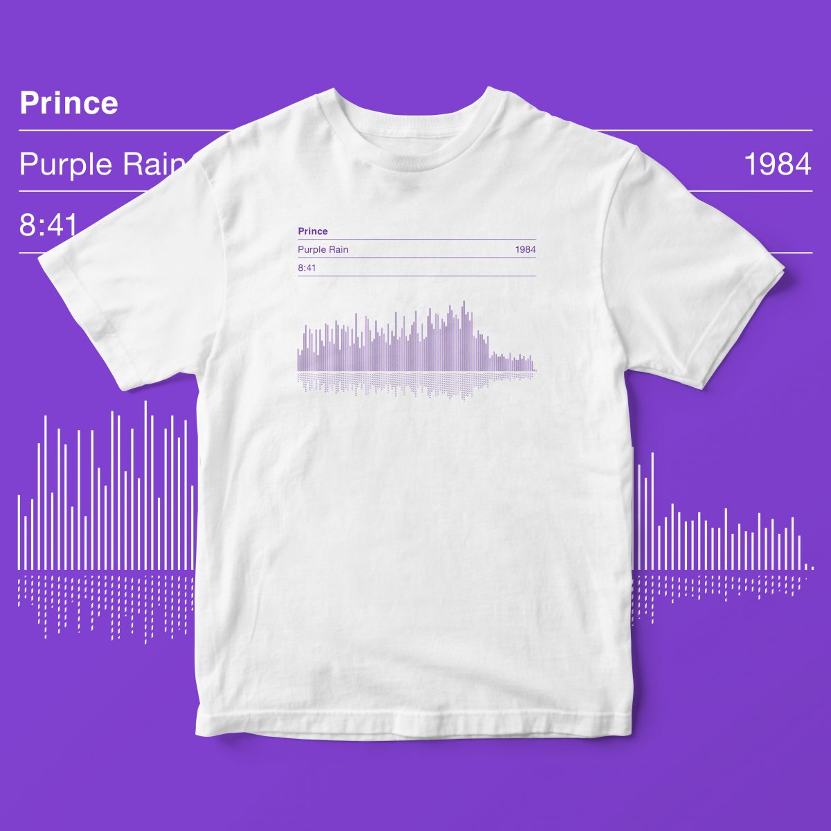 This a hand screen printed crew neck T-shirt featuring an original Serigrafica7585 design. The T-shirt displays the vital info including song title, song length, date of release and dynamic sound wave for Prince’s classic 80’s hit ‘Purple Rain’.