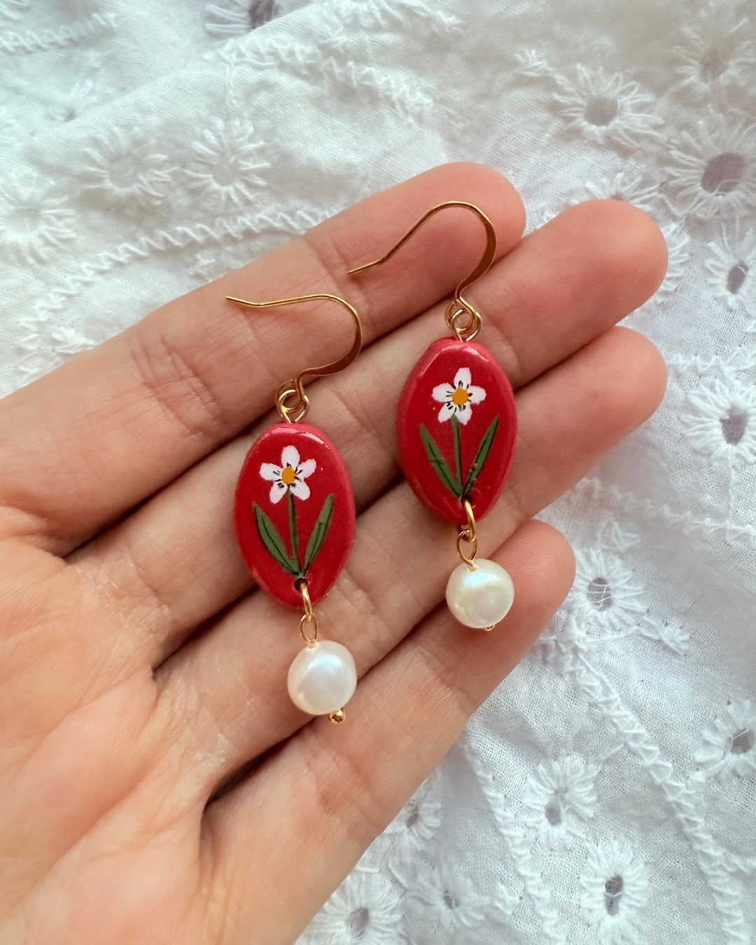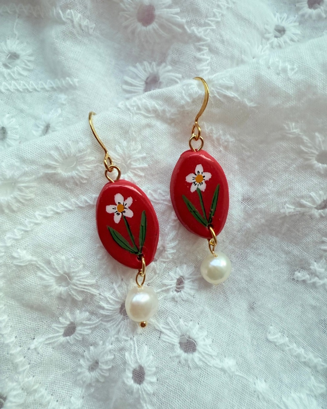 Each earring features a glossy Cherry Red oval polymer clay charm, hand painted with a delicate White daisy and Green leafy details. A natural freshwater pearl drop adds gentle movement and elegance, finished with gold-tone hooks for a warm, classic look.