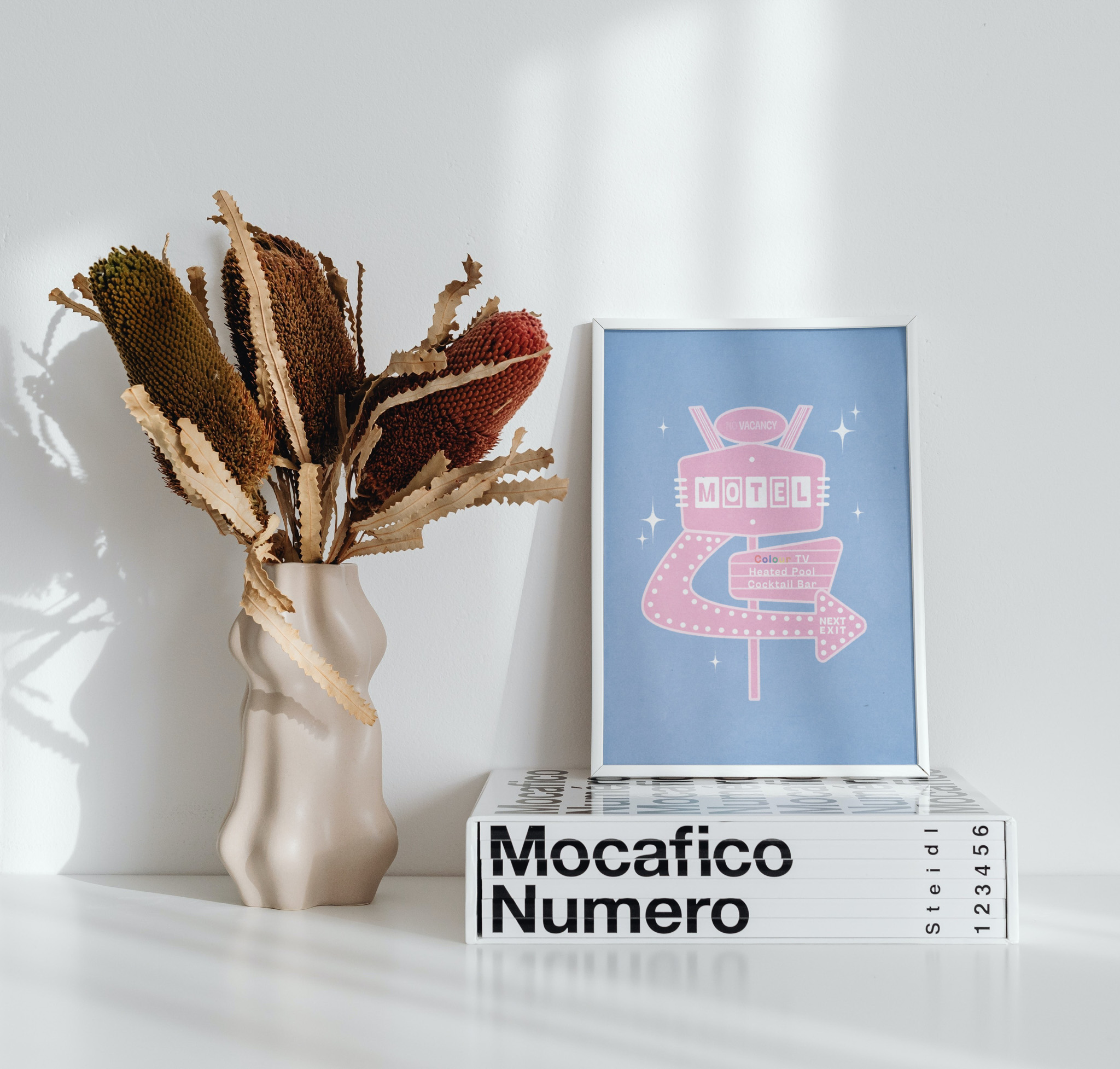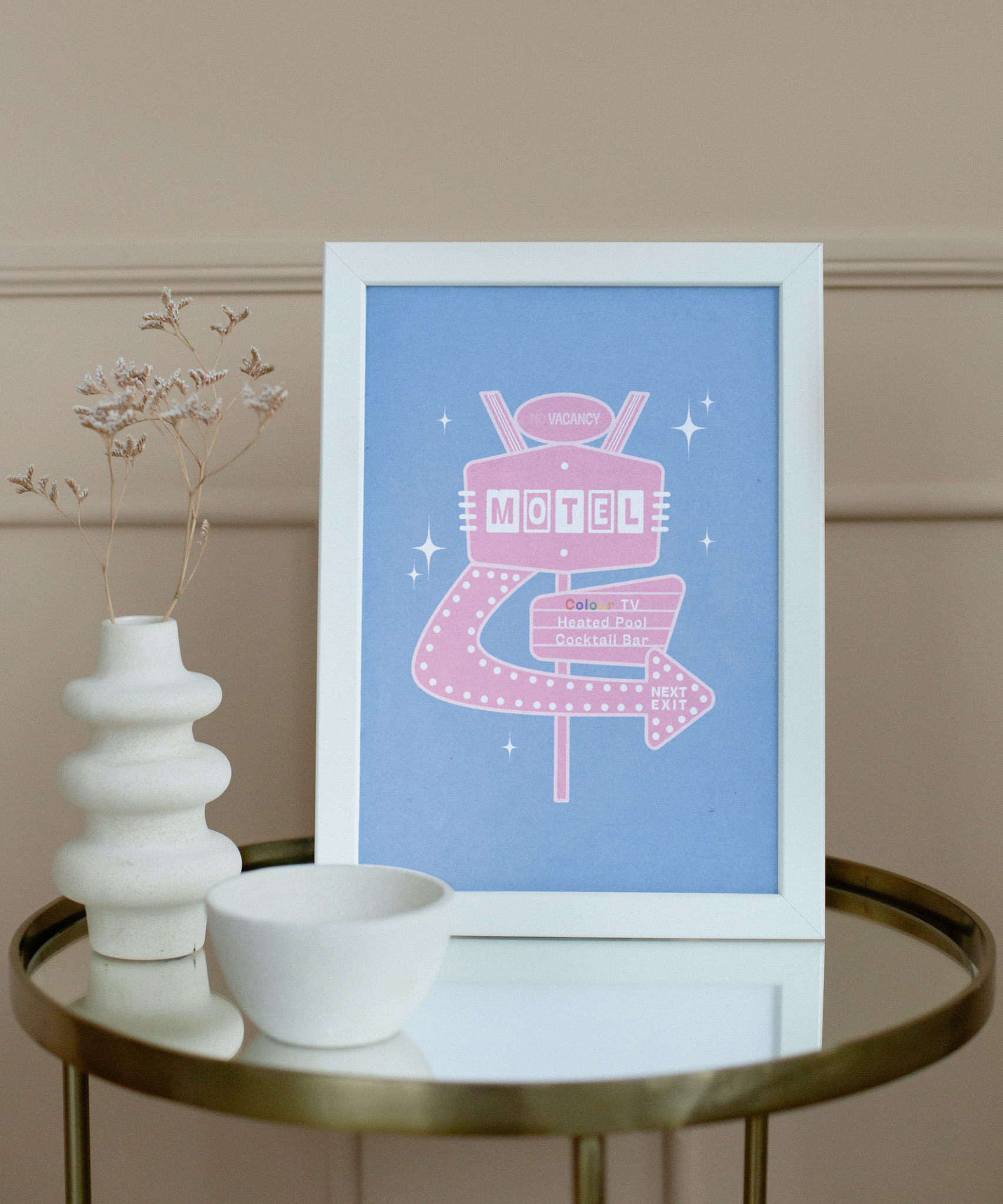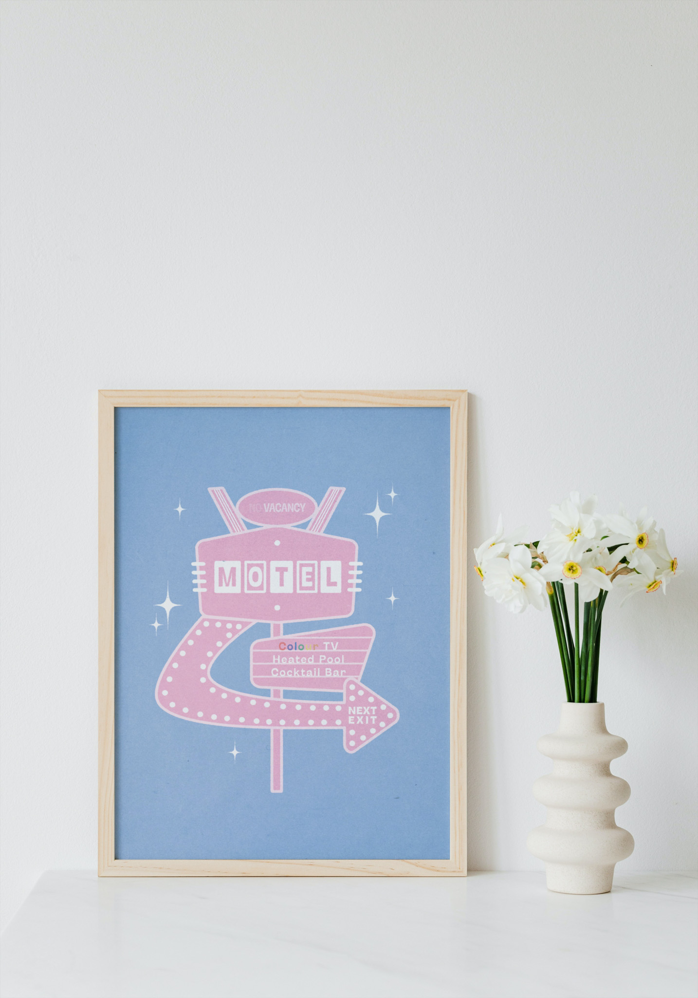 Step into the swinging 60s and advertise the hottest new highway motel in your home. Illustrated in classic mid-century modern style with pops of colour from today, this retro motel sign really has that retrofuturistic twist.