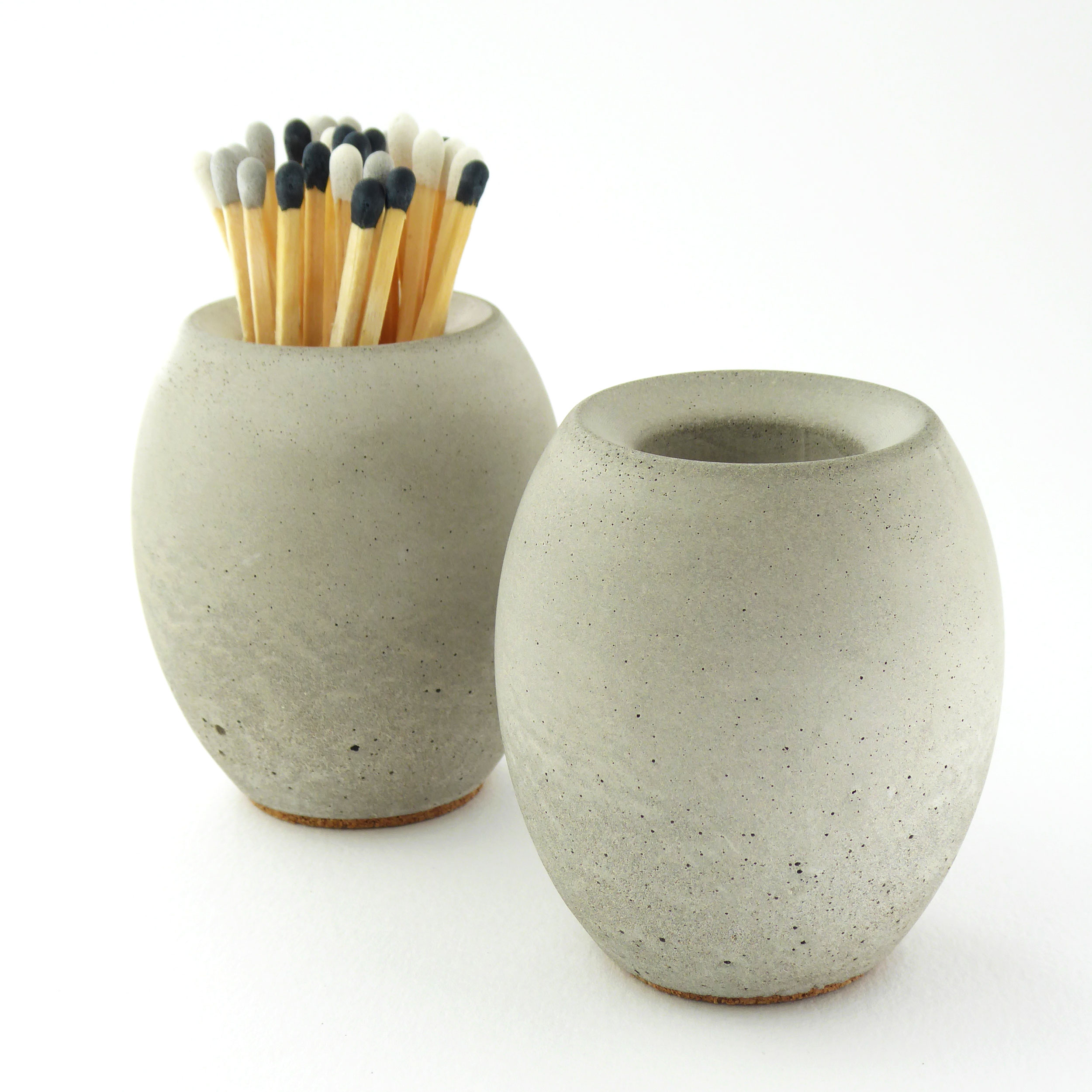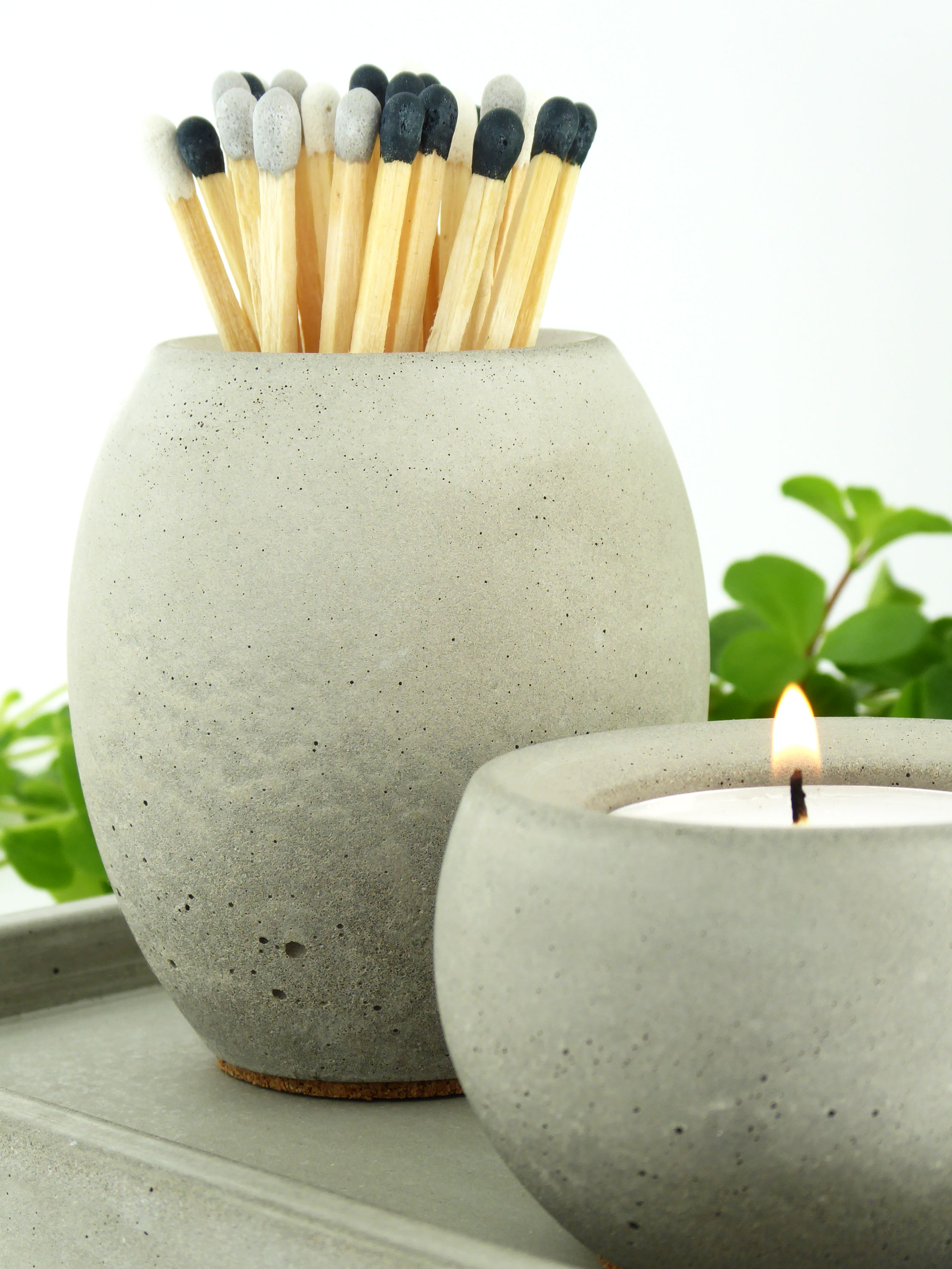 Elevate your coffee table, fireplace, or candle collection with this handmade concrete match pot. Available in a natural grey or natural white finish, this gorgeous little pot comes ready filled with long matches. Each piece is individually cast by us, revealing subtle variations in tone and texture that celebrate the beauty of hand poured concrete.