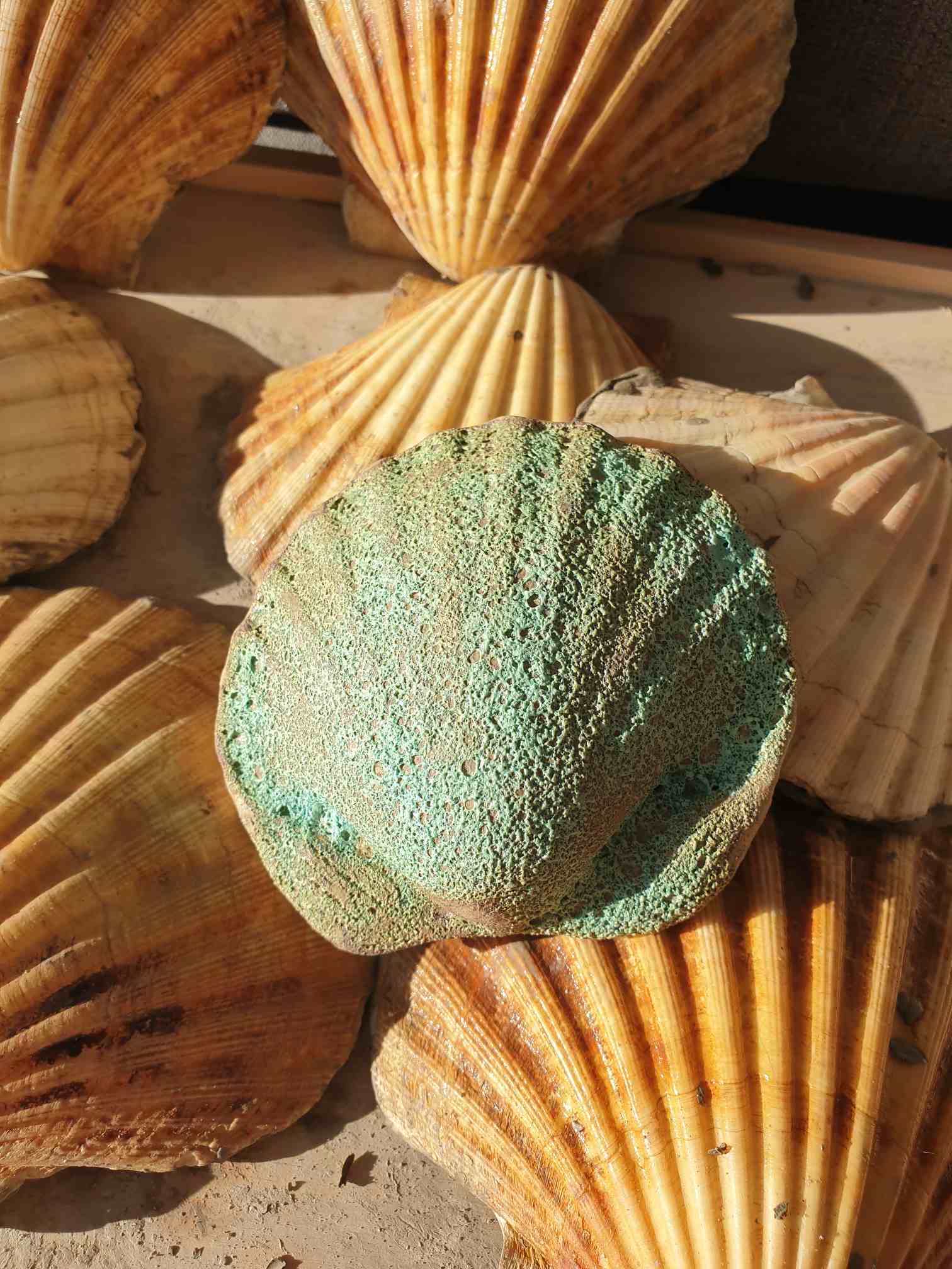 Beautiful palm sized scallop shell with bright blue bubbly glaze
