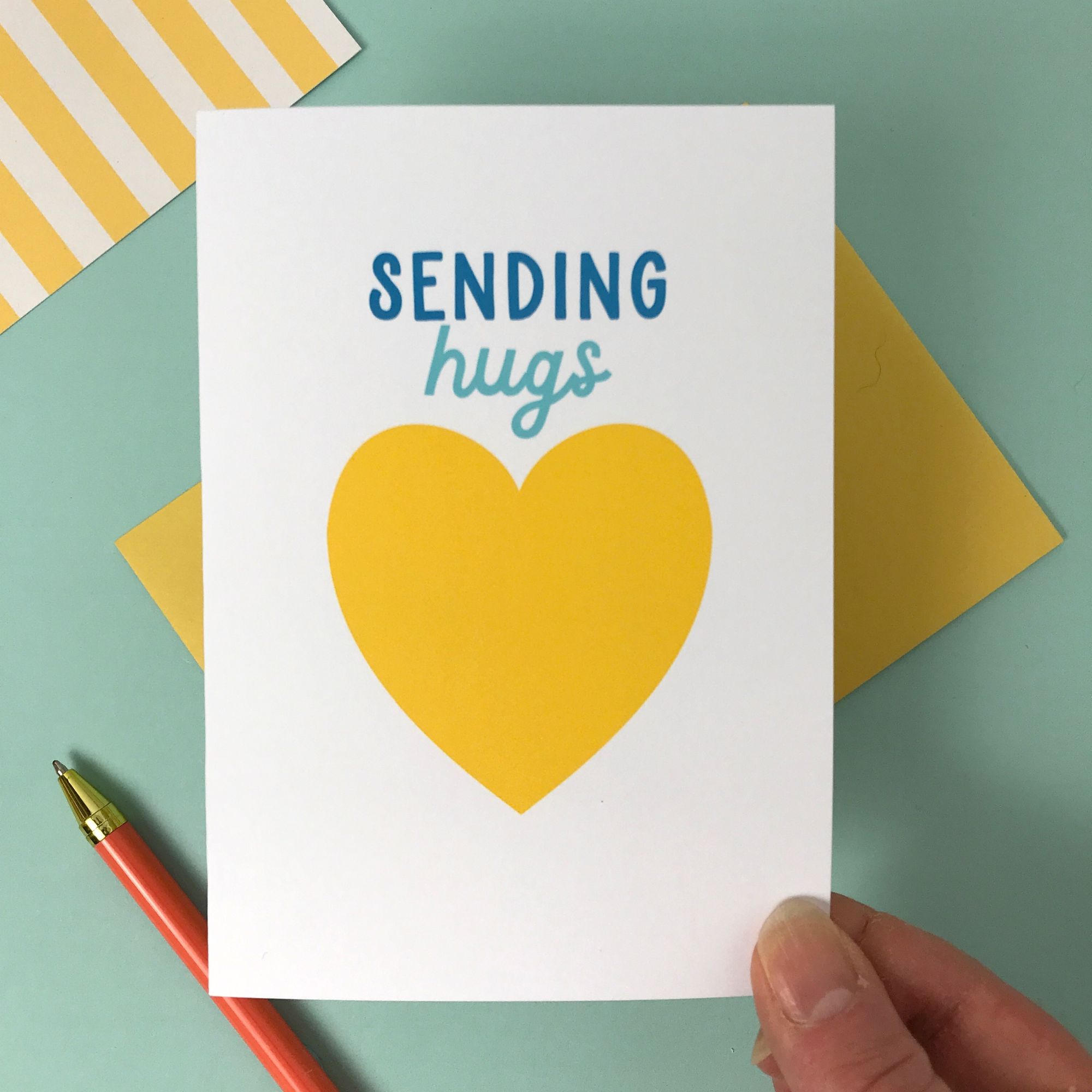 This is a lovely card to send to let someone know you are thinking of them. It reads “sending hugs” in teal print and below is a large yellow heart. It is left blank inside for you to add your own personal message. Each card is supplied with a mustard yellow envelop.