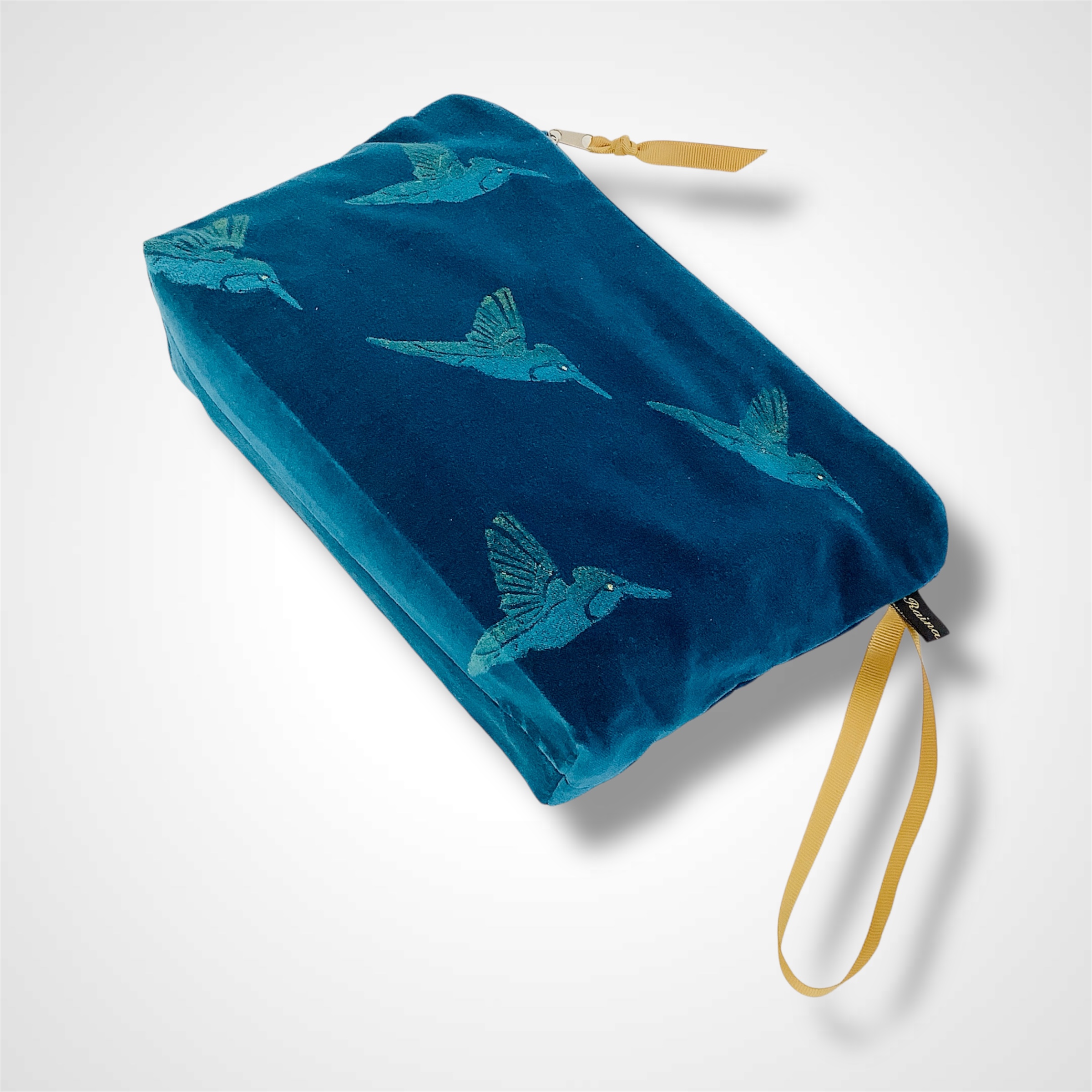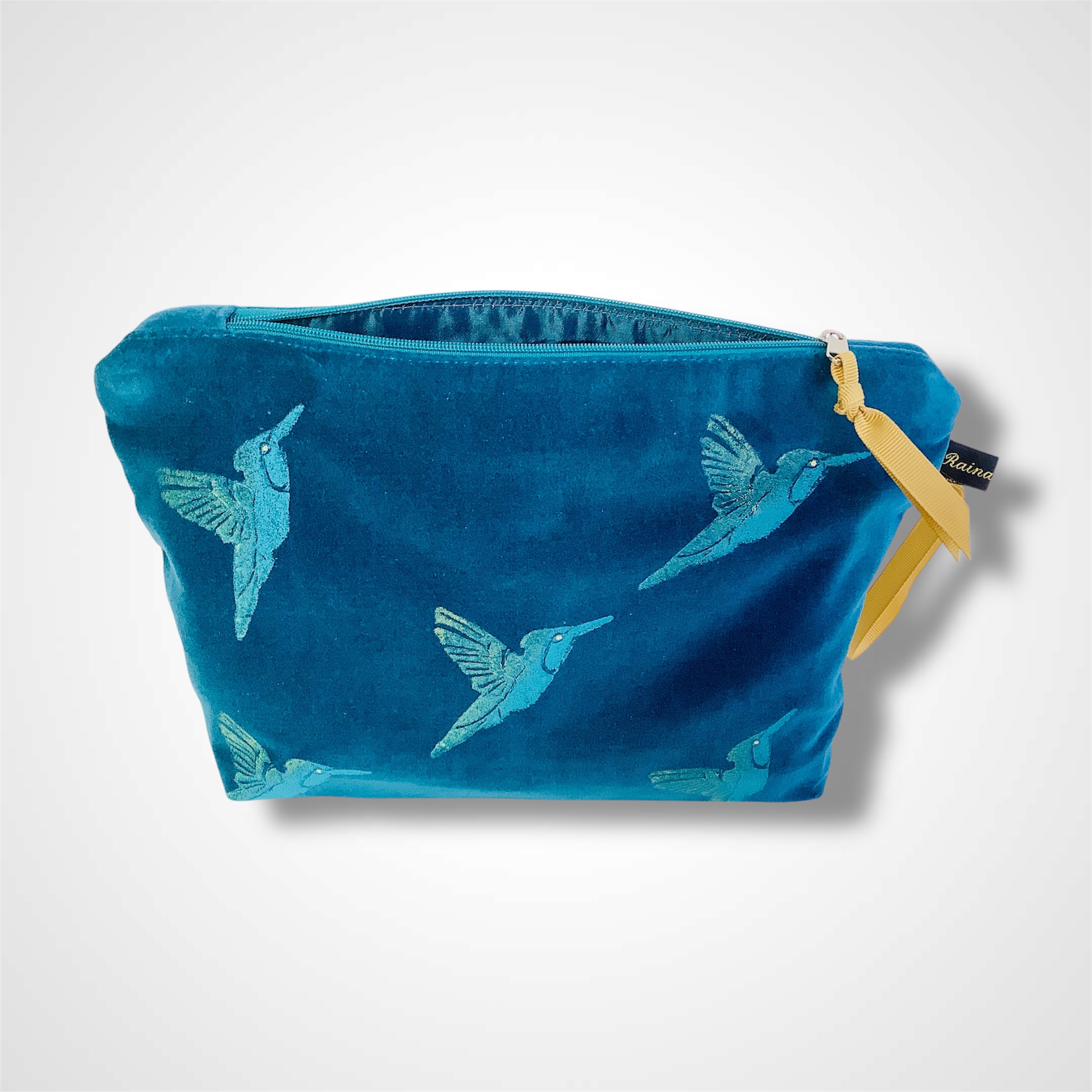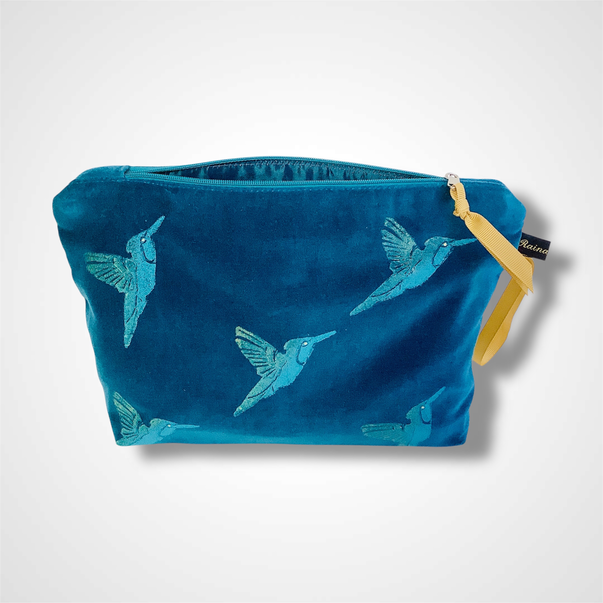 Introducing Raina Atelier Teal Hummingbirds Velvet Makeup Bag, an exquisite addition to your daily makeup routine and unique art accessory.