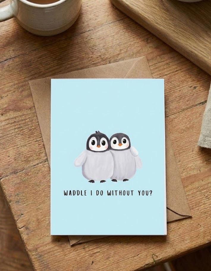 This adorable Valentine’s, anniversary, or “I’ll miss you” card features a sweet illustration of two penguins paired with the playful pun “Waddle I Do Without You.” Fun, heartwarming, and delightfully light-hearted, this card is perfect for anyone who enjoys a clever joke alongside a meaningful message.