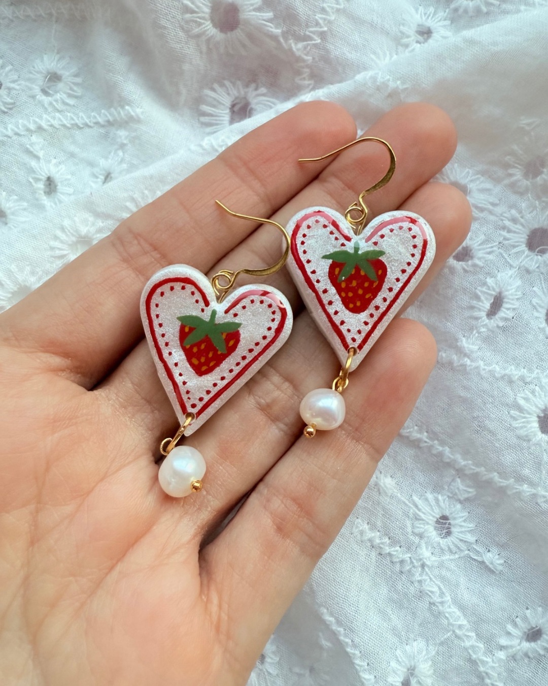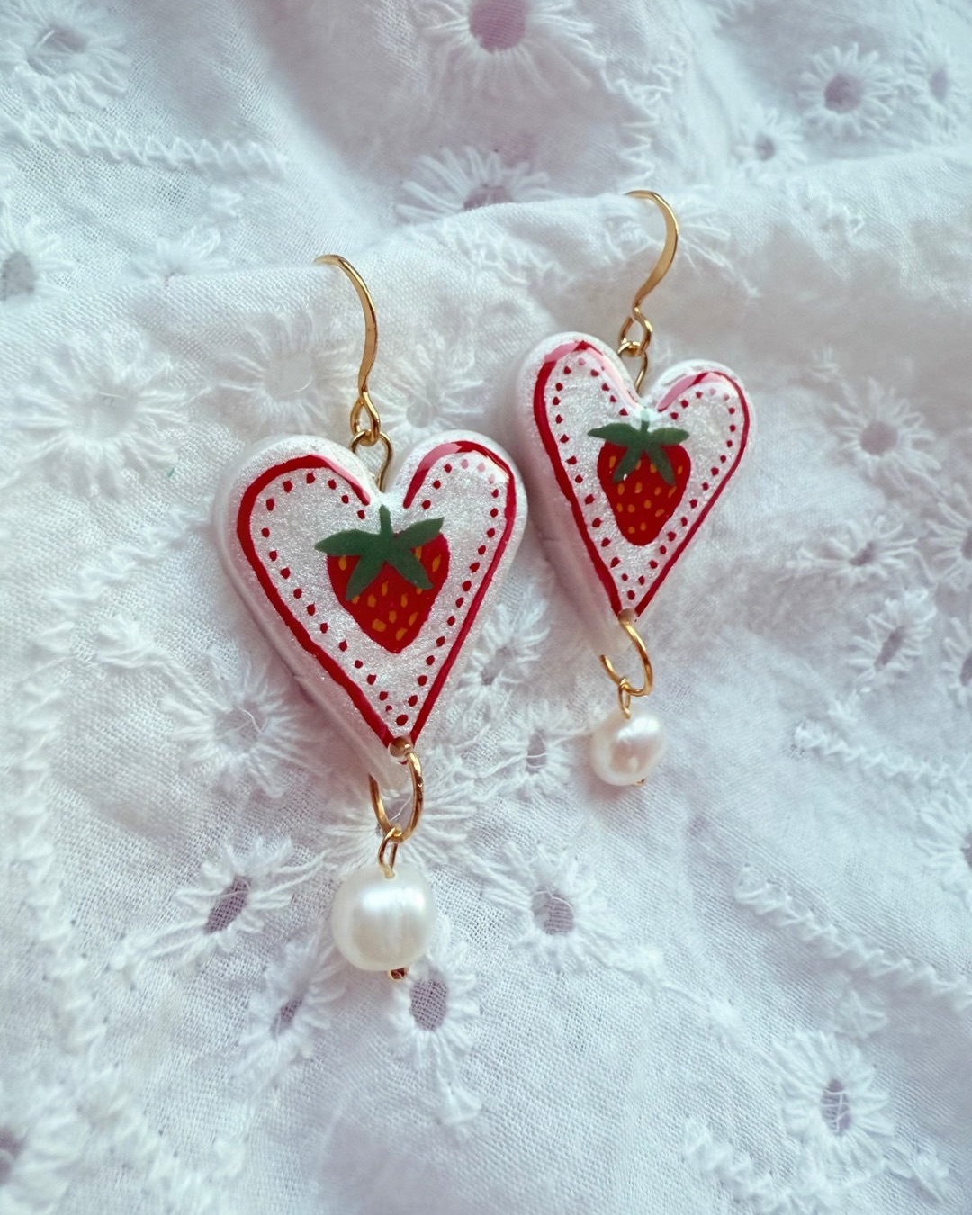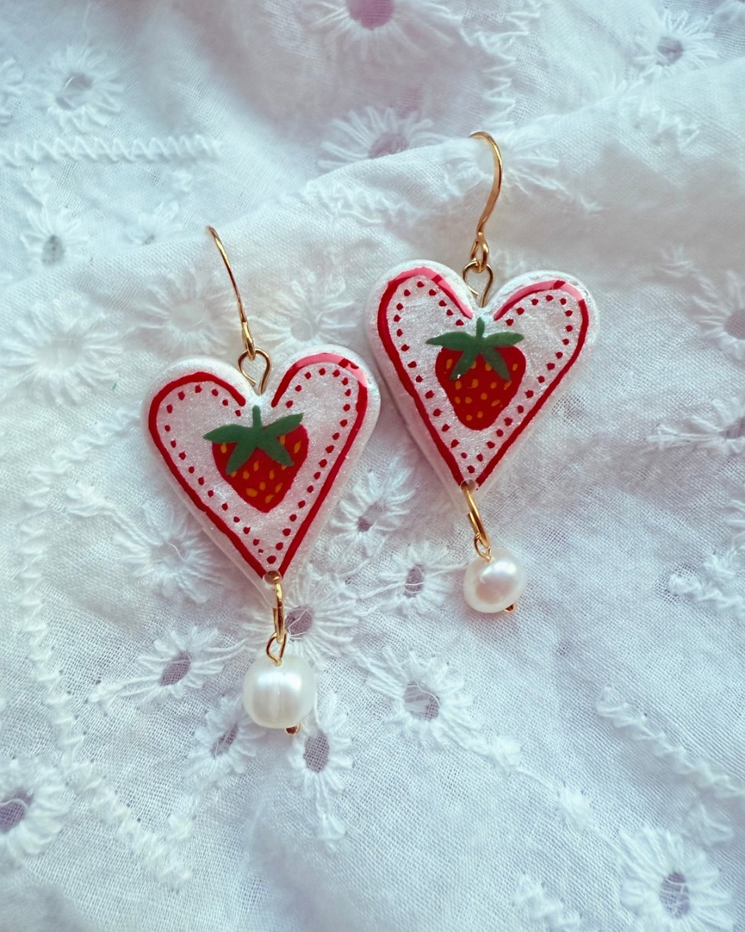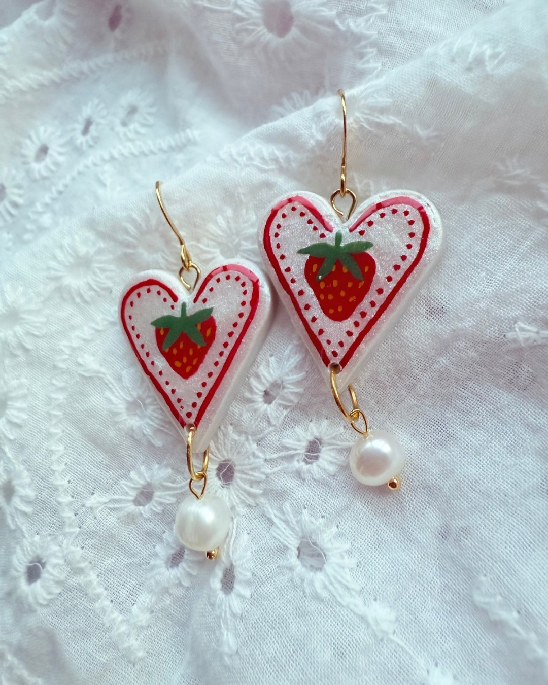 White shimmer heart-shaped polymer clay earrings, hand painted with a Strawberries. Finished with a natural freshwater pearl drop and Gold plated hooks, these earrings have gentle movement and a quirky look.