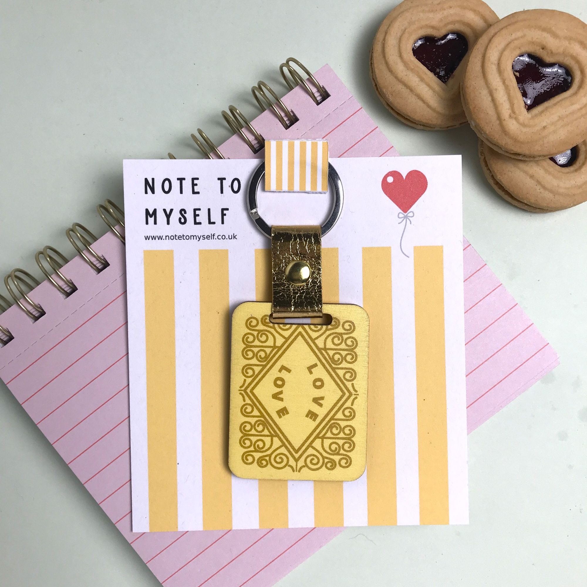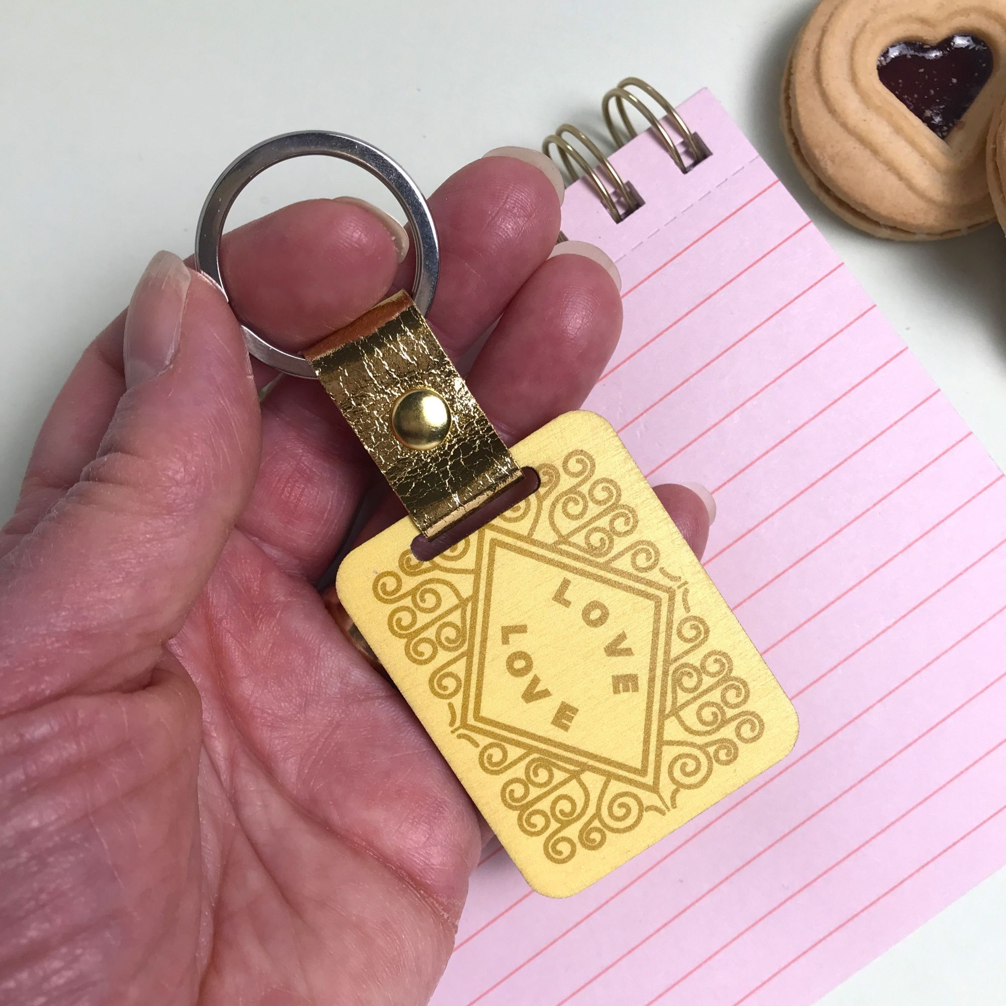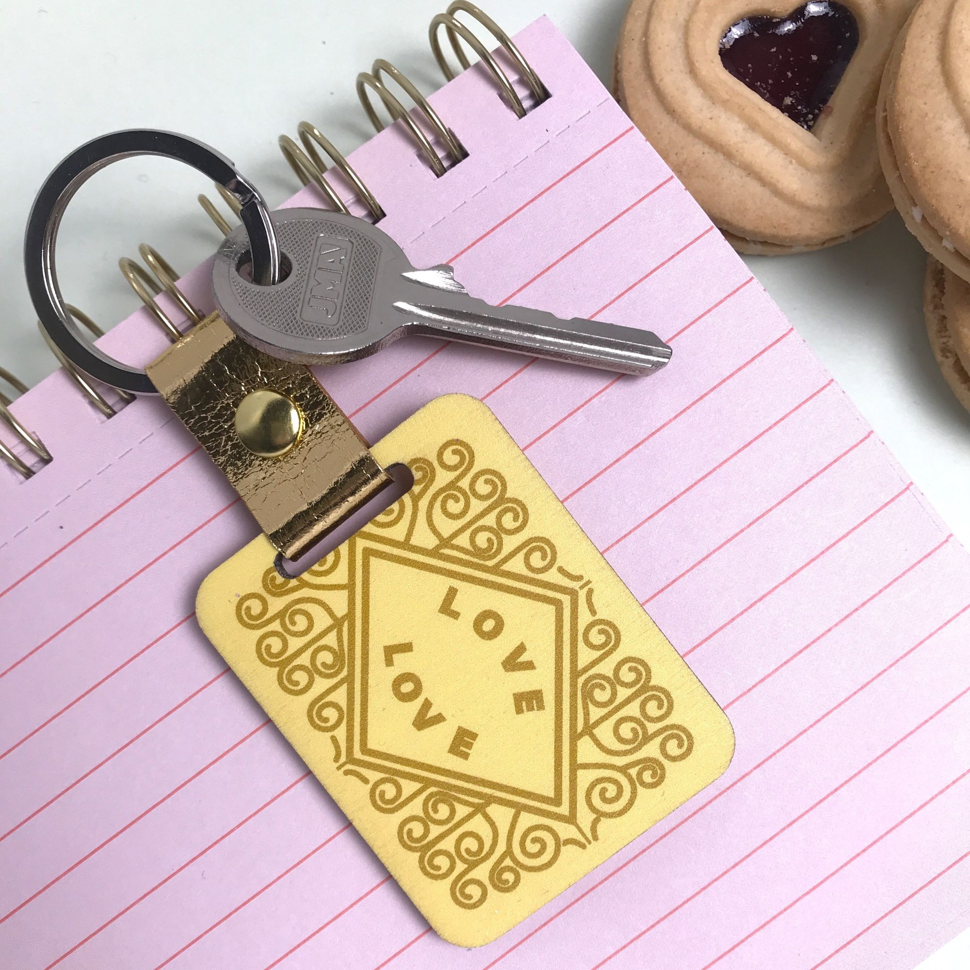 Who doesn’t love a custard cream. This keyring is made from wood and cut in the shape of the family favourite biscuits but with a twist. The words “Custard Cream” are replaced with “Love”. The same design is printed front and back in a high quality UV print. Each keychain is finished with a faux leather band and metal ring.